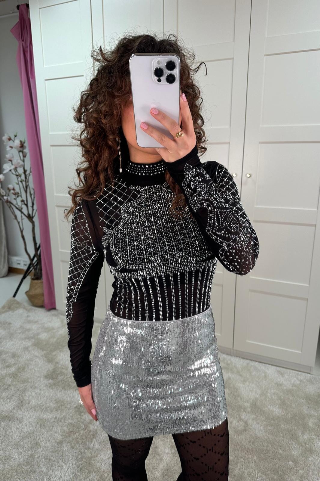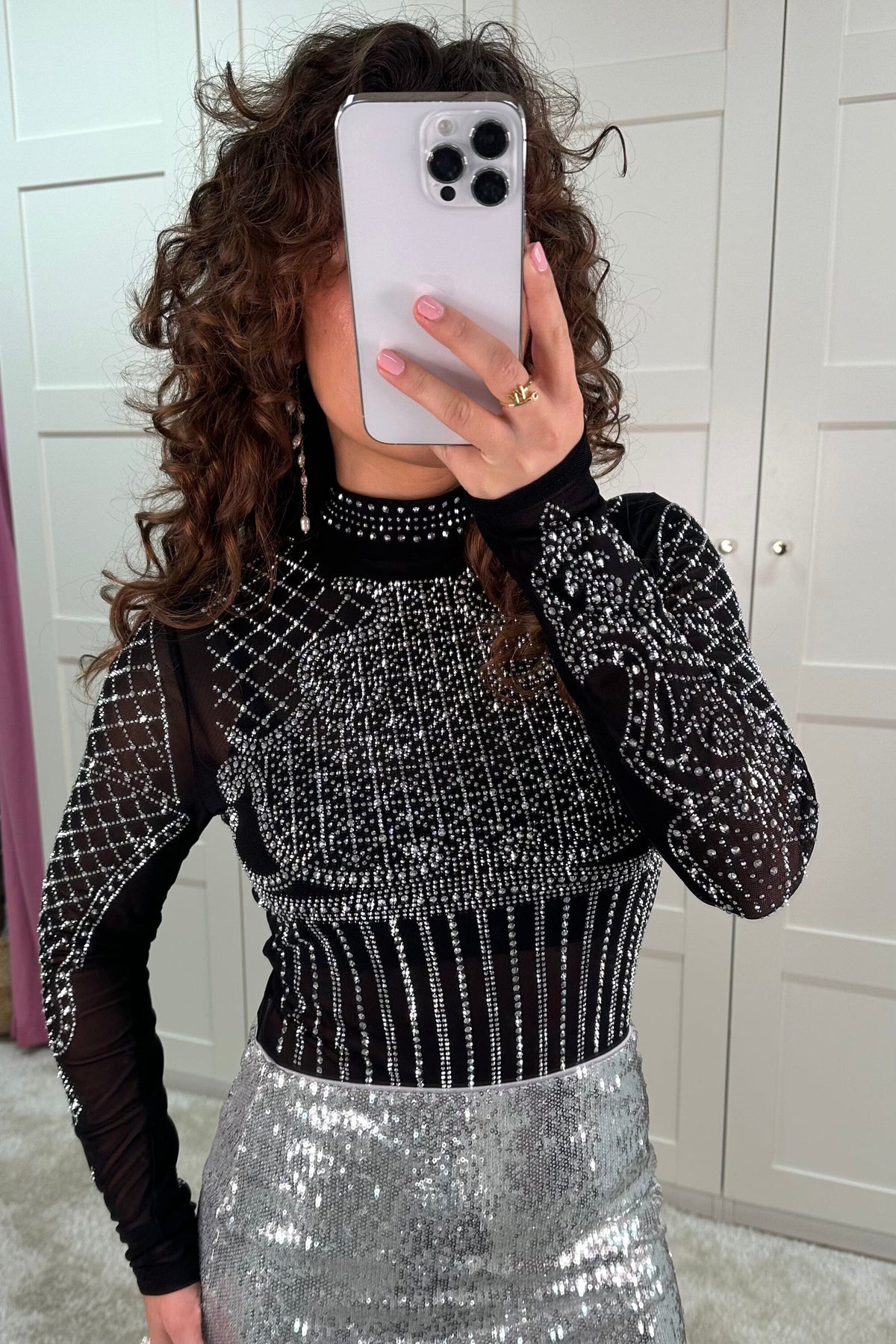 Svart bodysuit fra A-bee med rhinsten-dekorasjon. Designet for festlige anledninger der man vil skille seg ut med et iøynefallende utseende.
