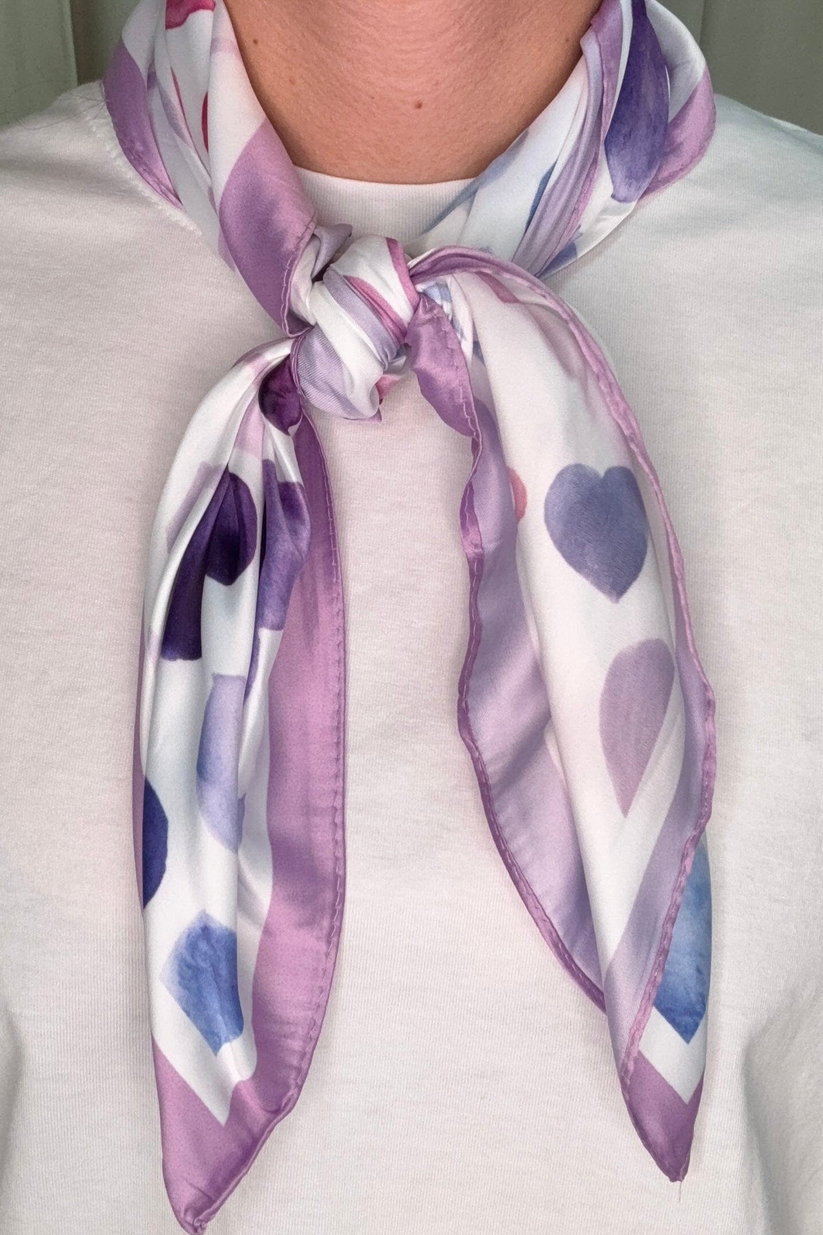 Skjerf fra A-bee med hjerte-mønster i lilla og rosa på hvit bakgrunn. Skjerfet kan brukes både rundt halsen og som pynt på vesker.