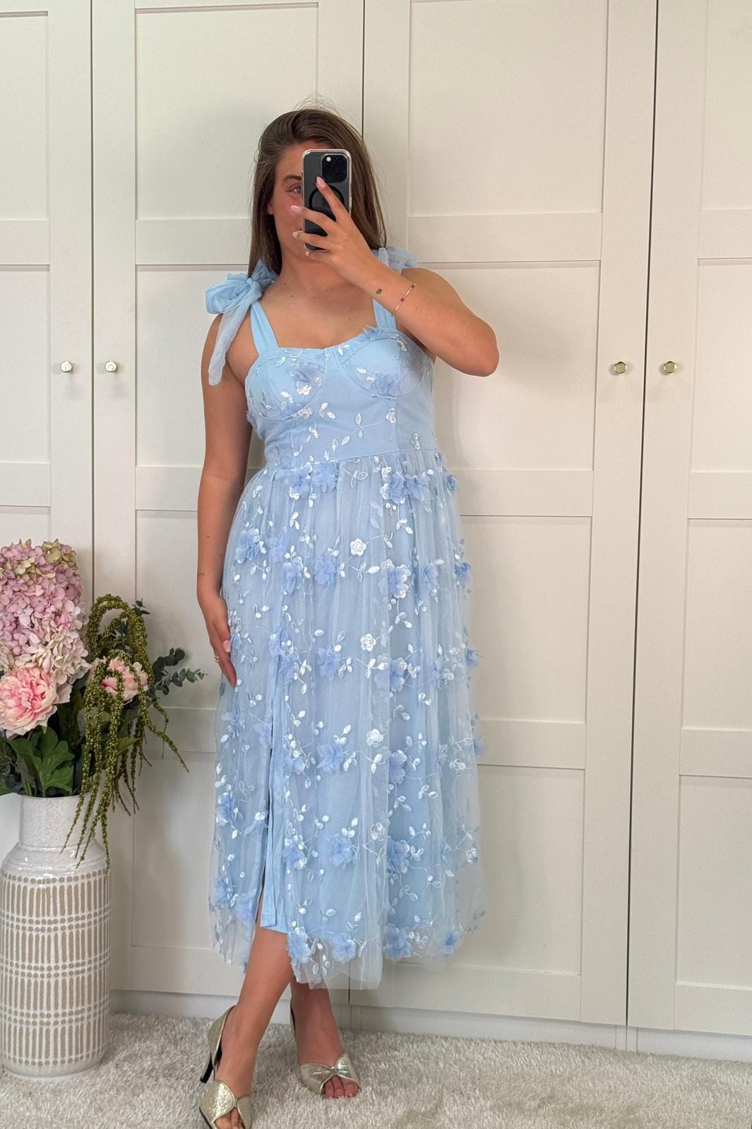 Lys blå kjole fra A-bee med blomsterbroderi og volanger. Den har en firkantet utringning og går til midt på leggen. Sløyfedetaljer på stroppene gir kjolen et fint preg.