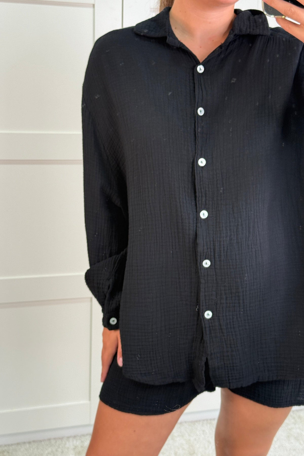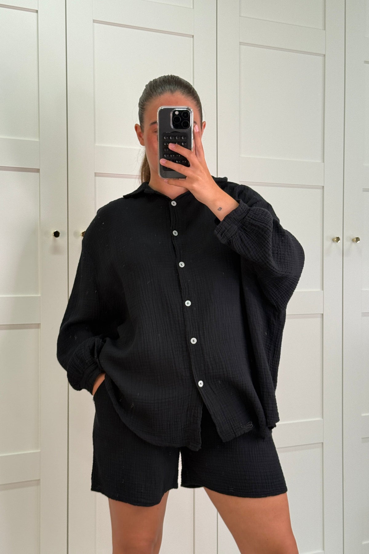 Svart sett fra A-bee i to deler med skjorte og shorts. Laget av ren bomull med knapper foran på skjorten og snøring i shortsene. Sett har en avslappet passform.