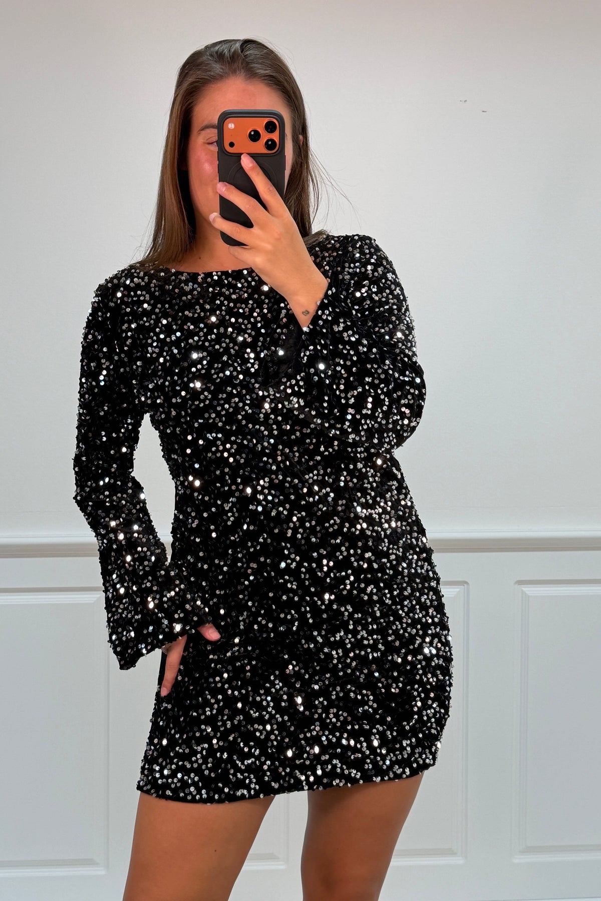 Festkjole fra A-bee med glitrende paljetter og sløyfedetaljer. Kjolen har en svart base med sølvfarget mønster og lange ermer. Den runde halsutskjæringen og sløyfen på ryggen gir kjolen et festlig preg.