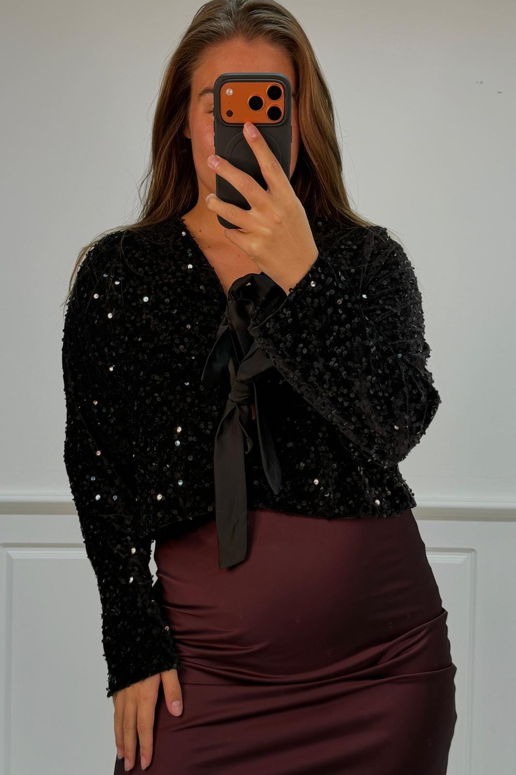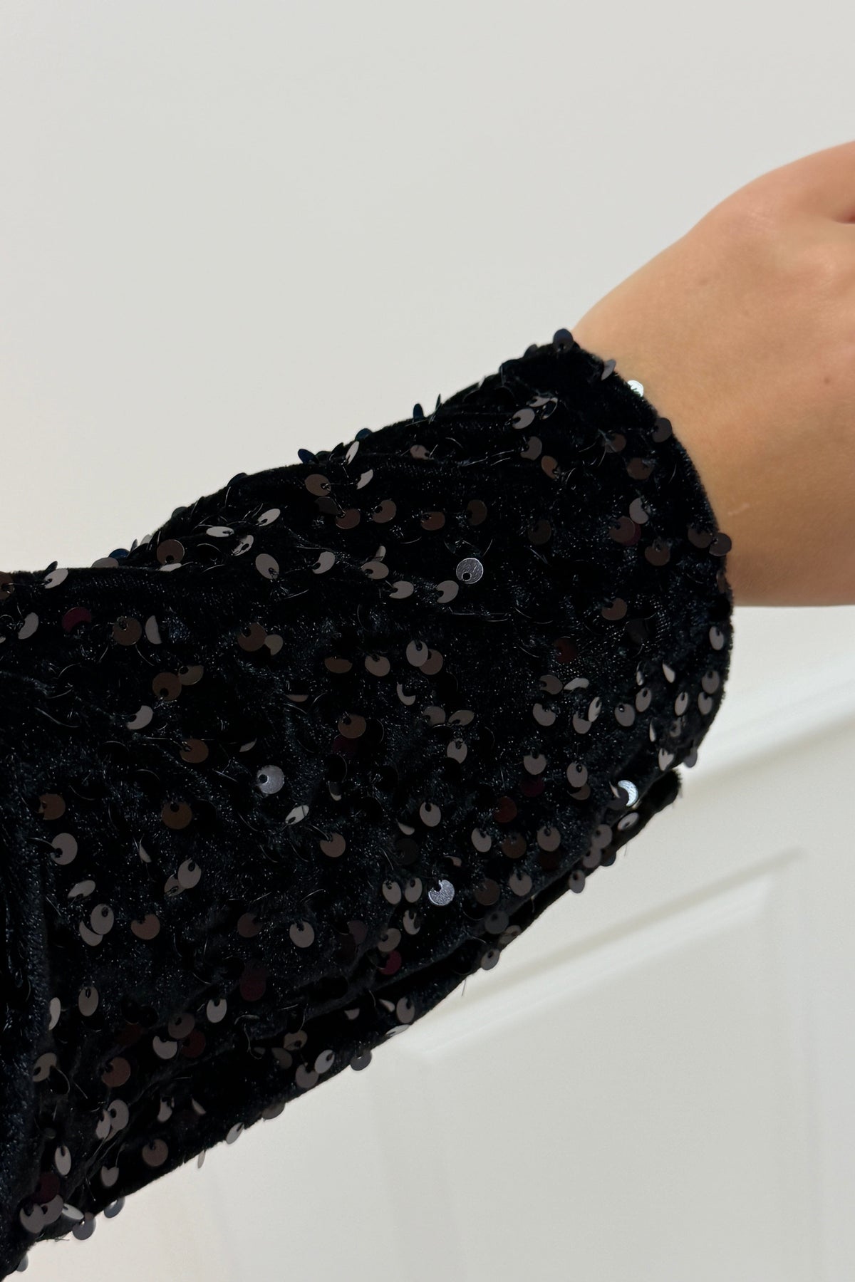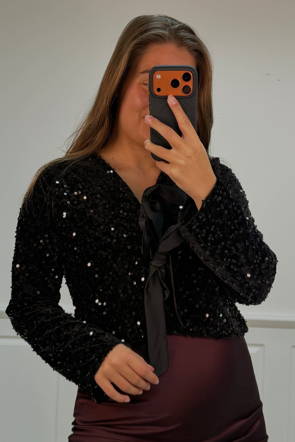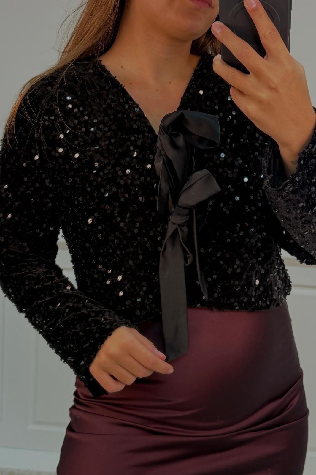 Svart bluse fra A-bee med paljetter og sløyfedetaljer. Blusen har en V-utringning med snørelukking og lange ermer. Den glitrende overflaten og de dekorative sløyfene gjør den velegnet til festlige anledninger.