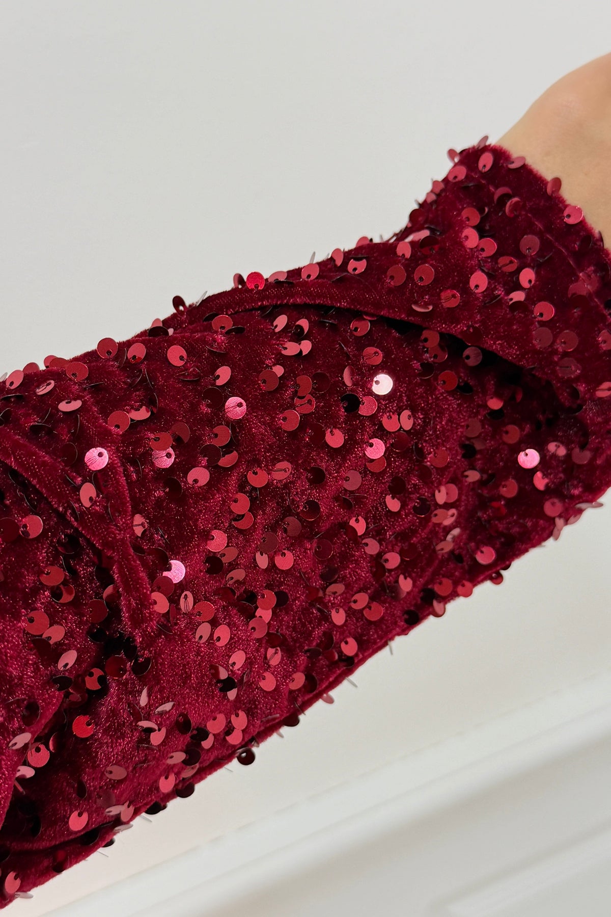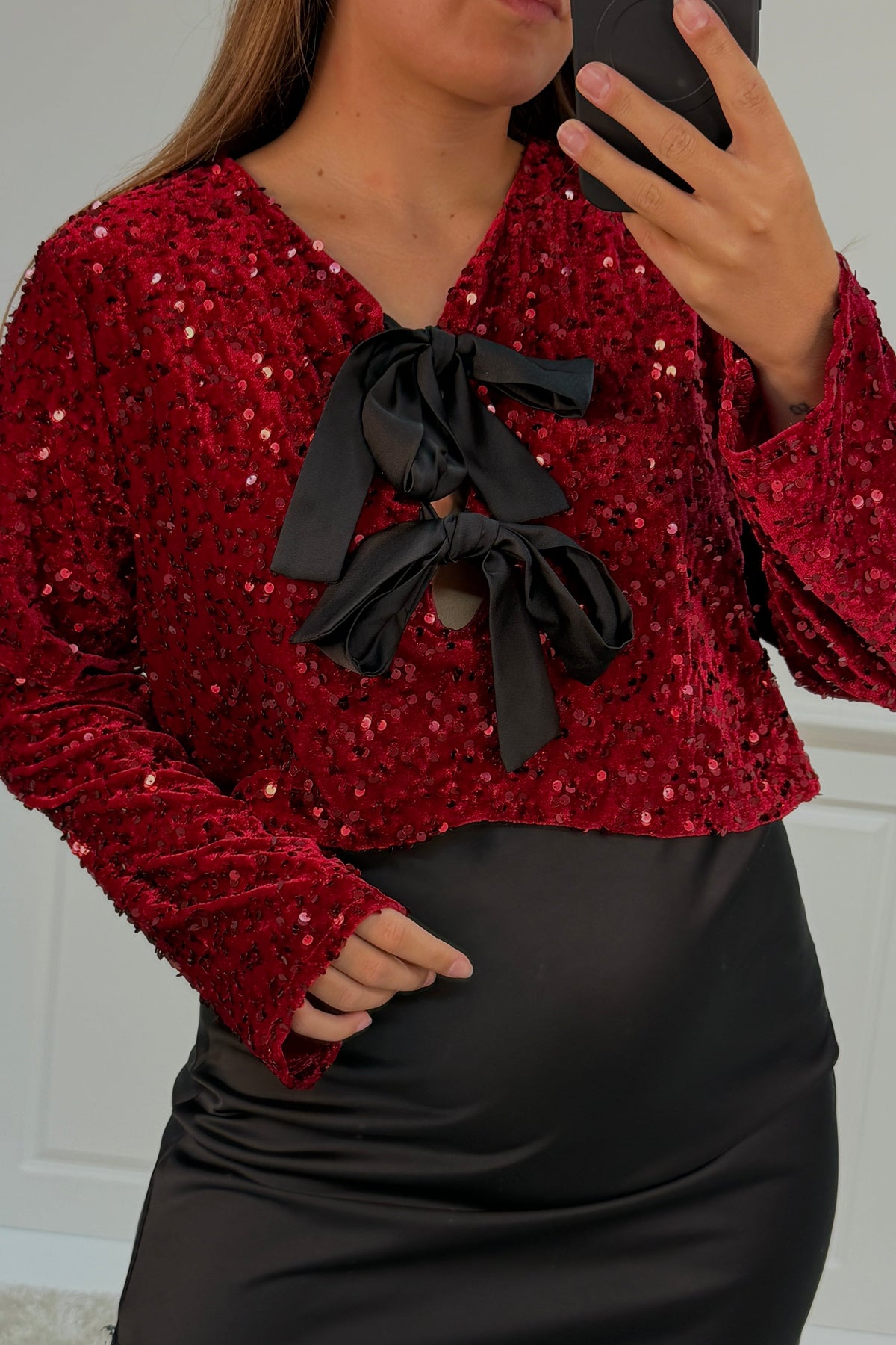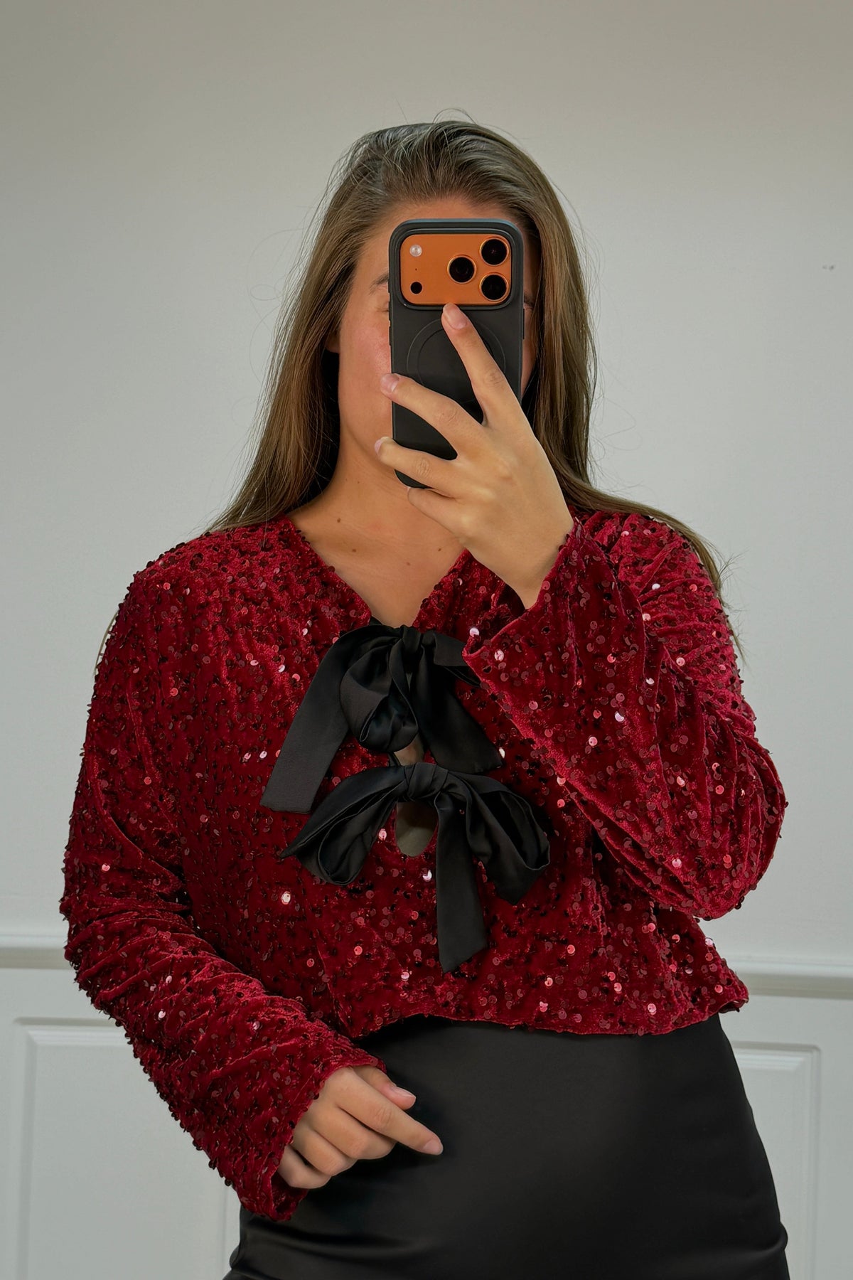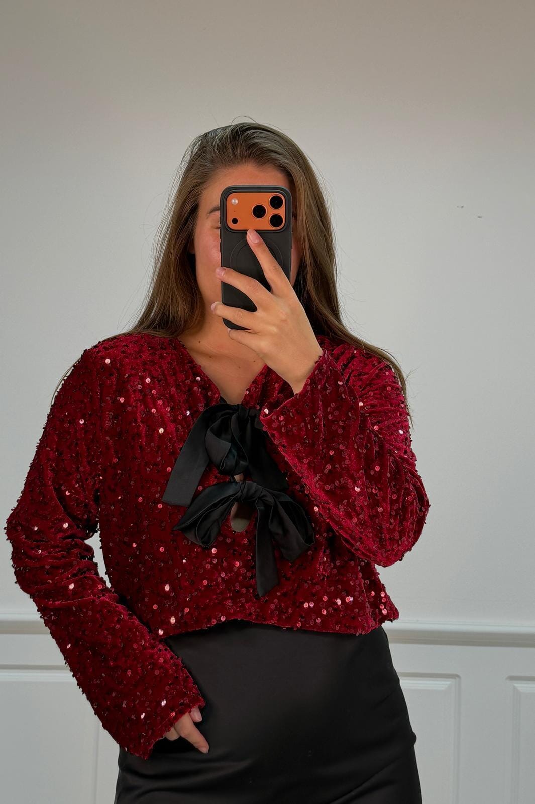 Bordeauxfarget bluse fra A-bee med paljetter over det hele. Den har lange ermer, V-utringning og en svart sløyfe ved halsen. Blusen lukkes med snøring og har en vanlig passform.