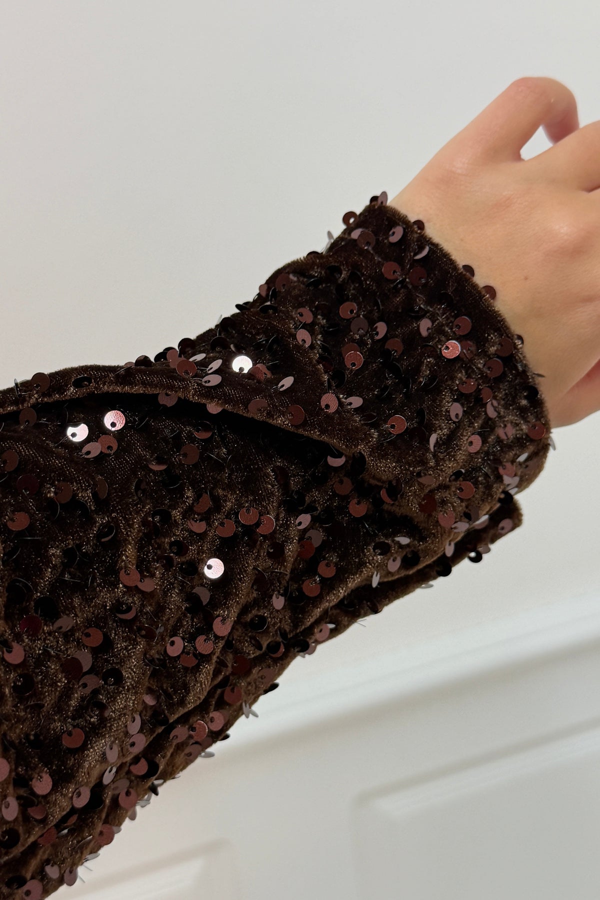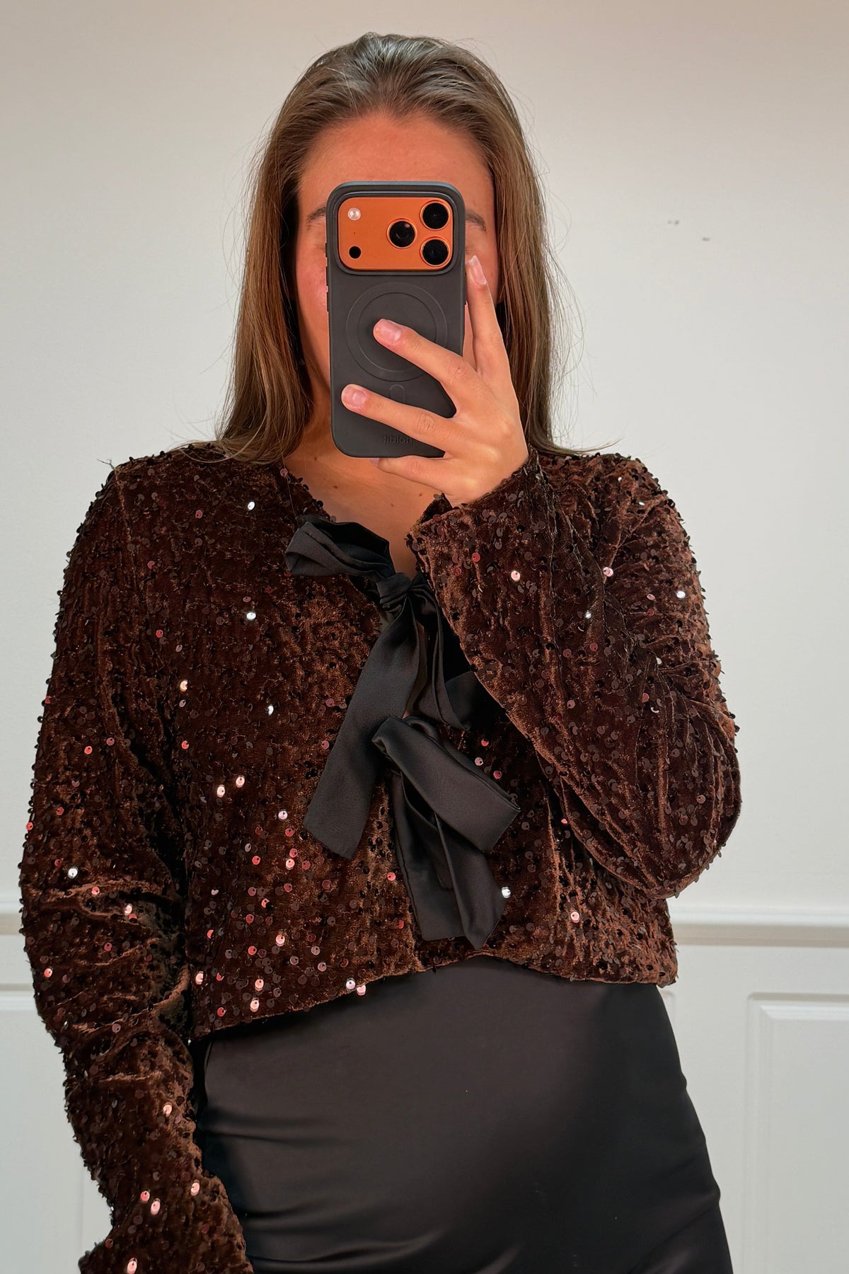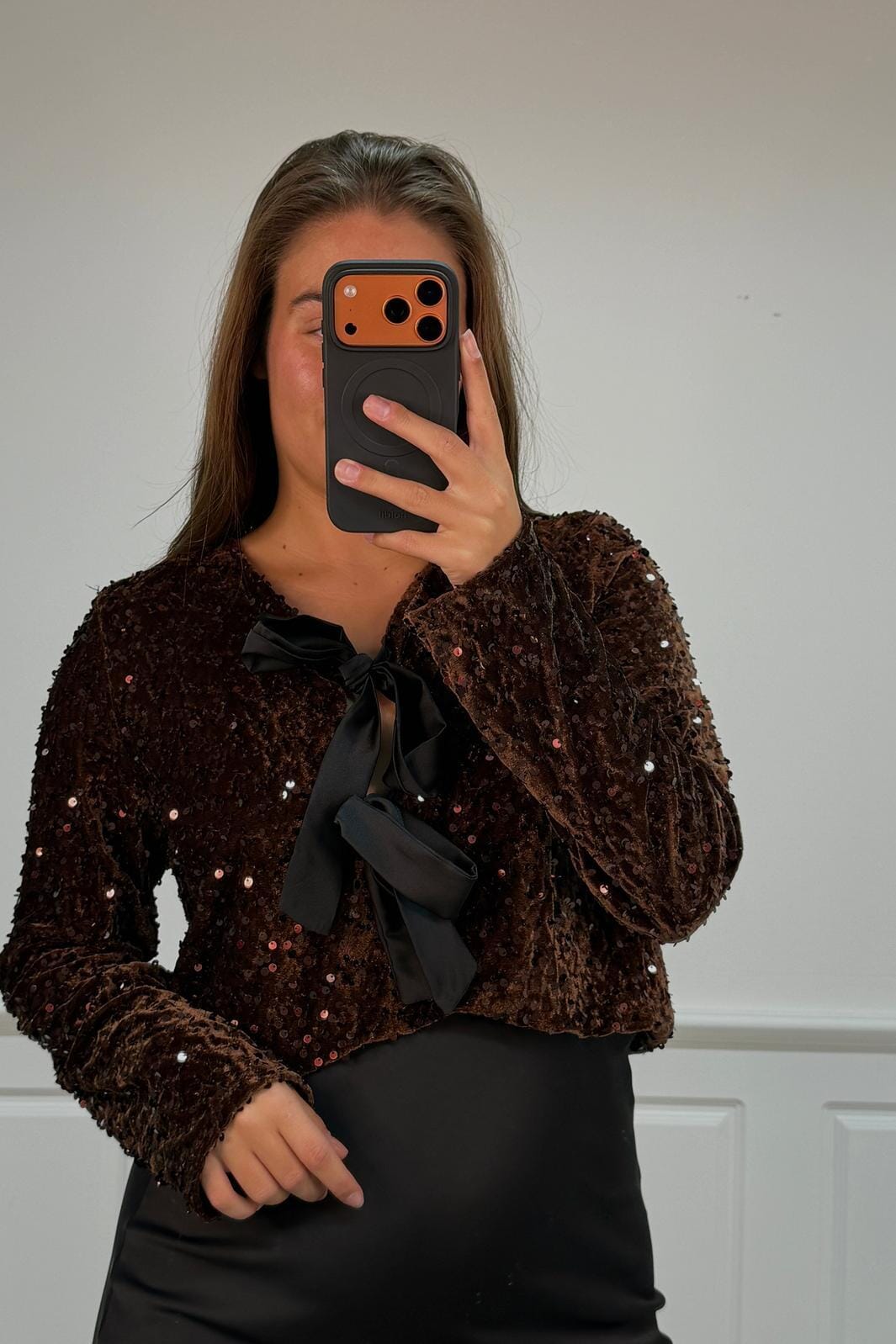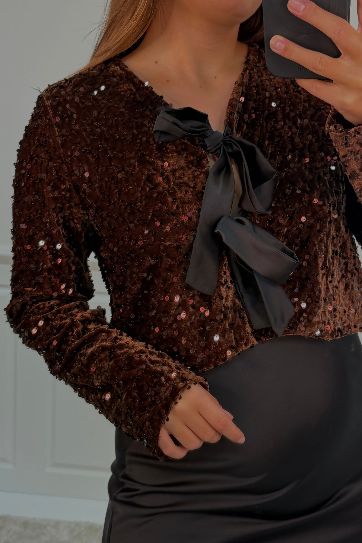 Mørk maroon-bluse fra A-bee med skinnende paljetter over det hele. Den har en svart sløyfe ved V-utskjæringen og lange ermer med en løs passform.