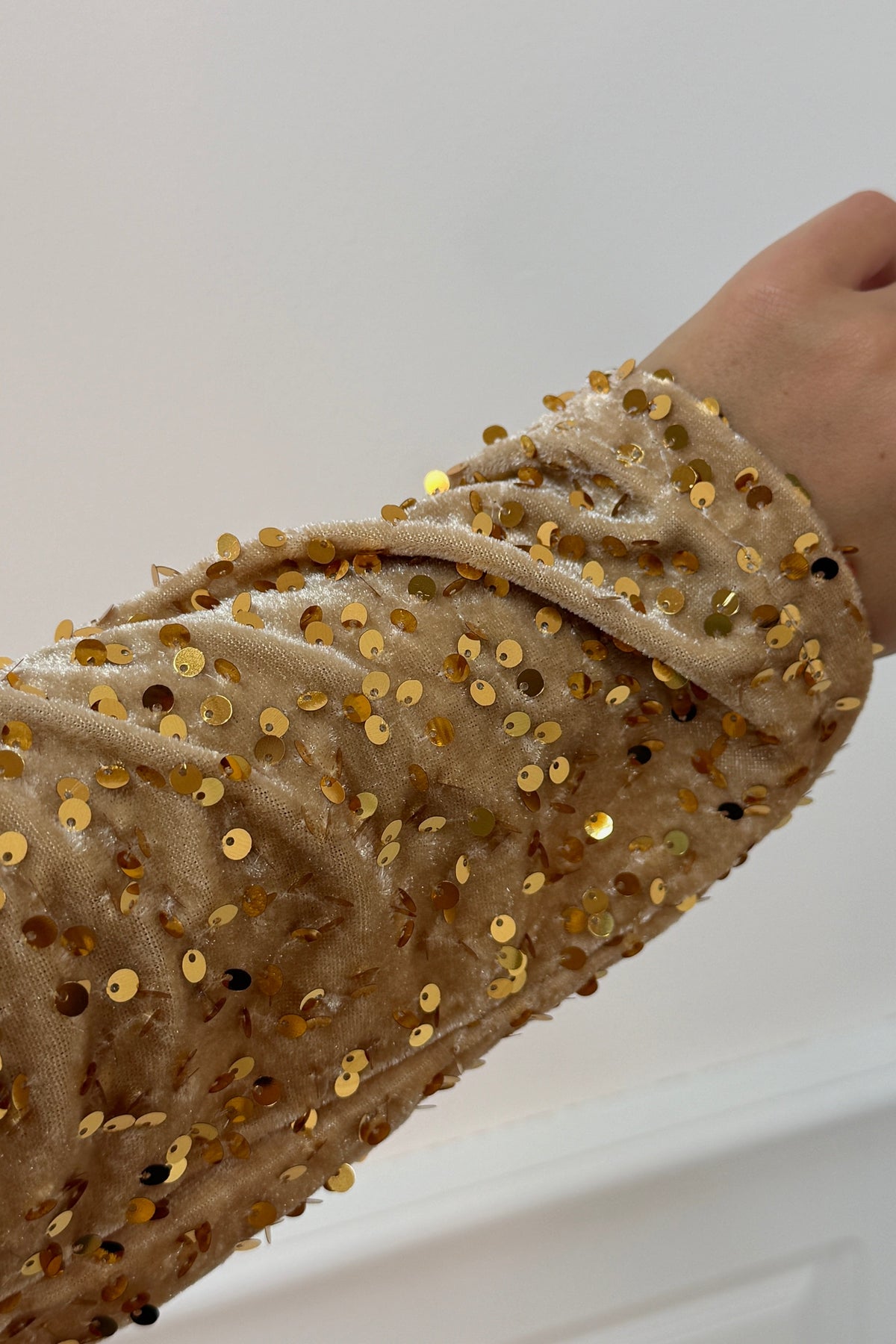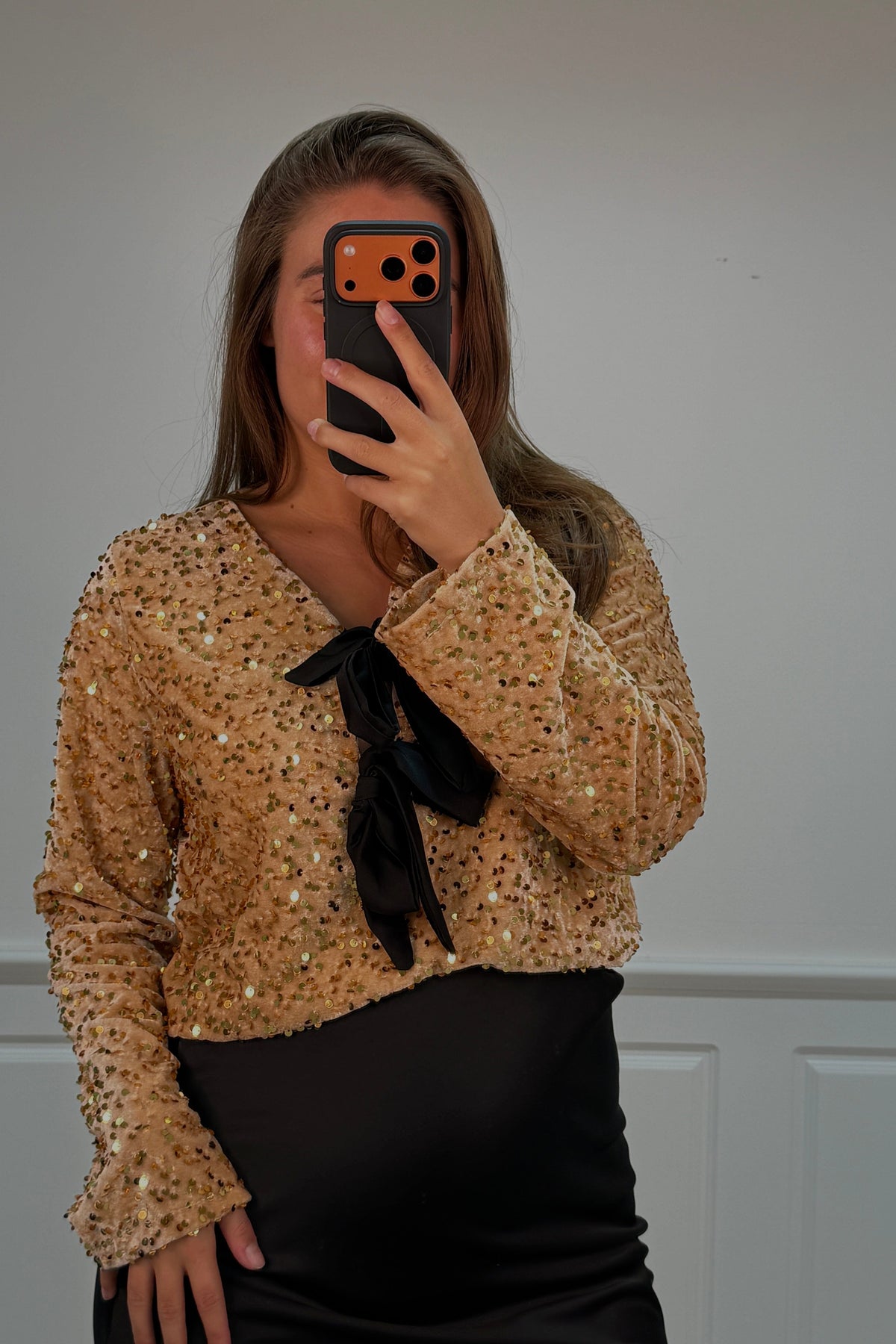 Gullfarget bluse fra A-bee med paljetter over hele overflaten. Den har lange ermer, V-halsutskjæring og svarte sløyfedetaljer ved halsen.