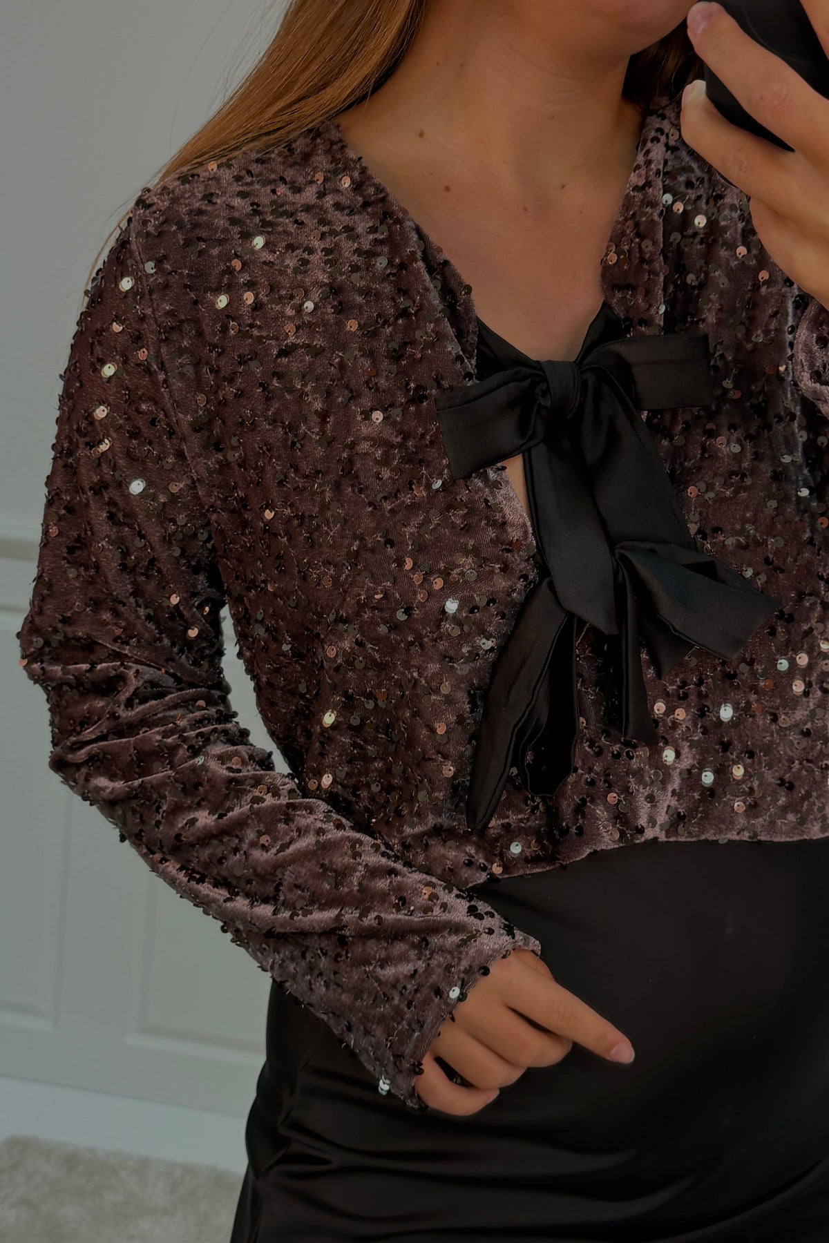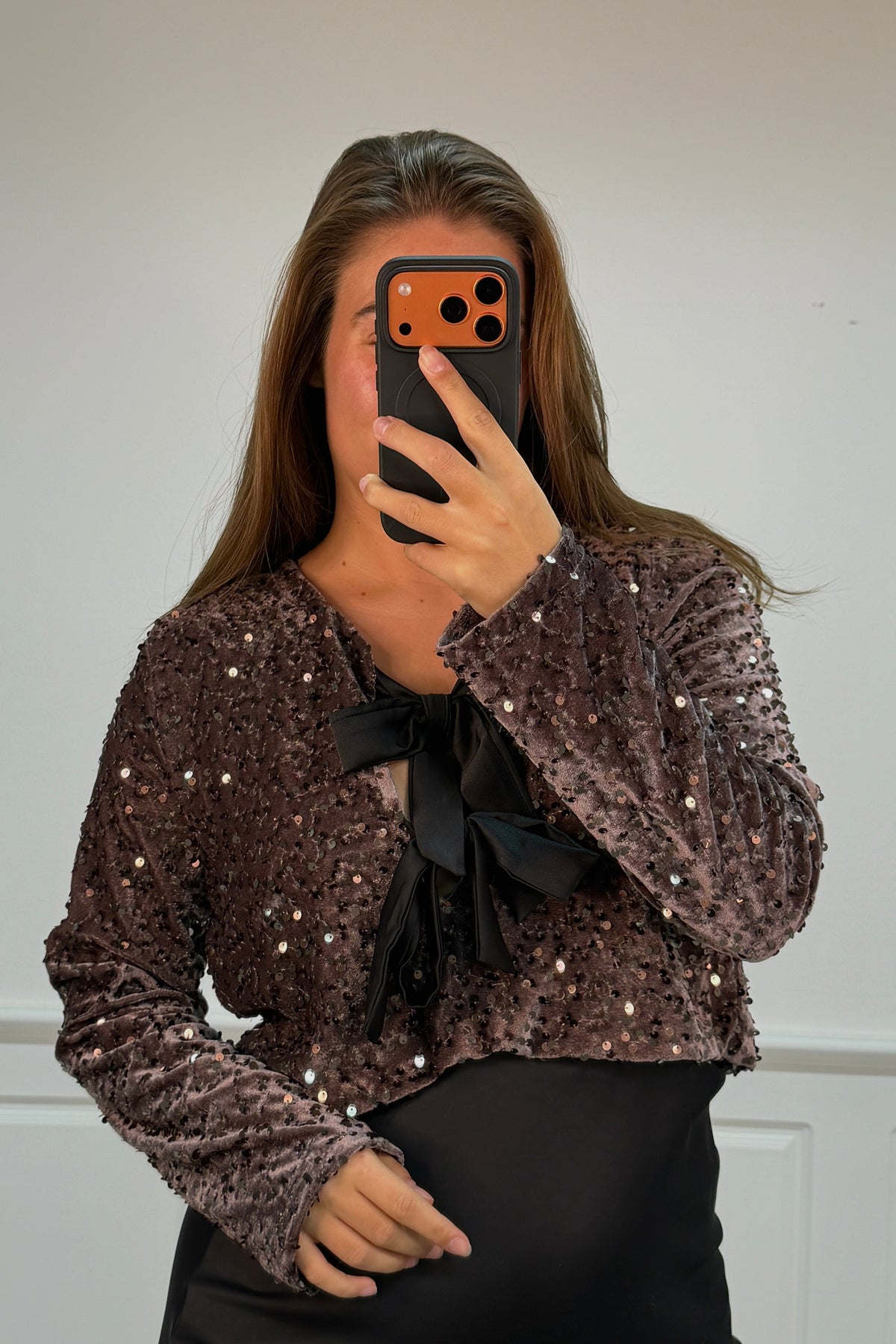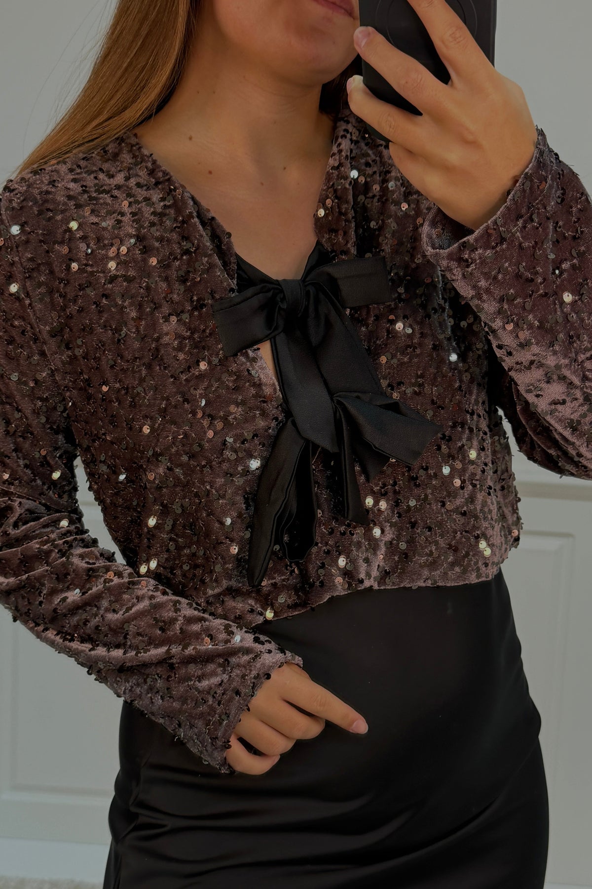 Festbluse fra A-bee i lys maroon med paljetter over hele stoffet. En V-utringning med svart sløyfe og lange ermer gir blusen et festlig preg.