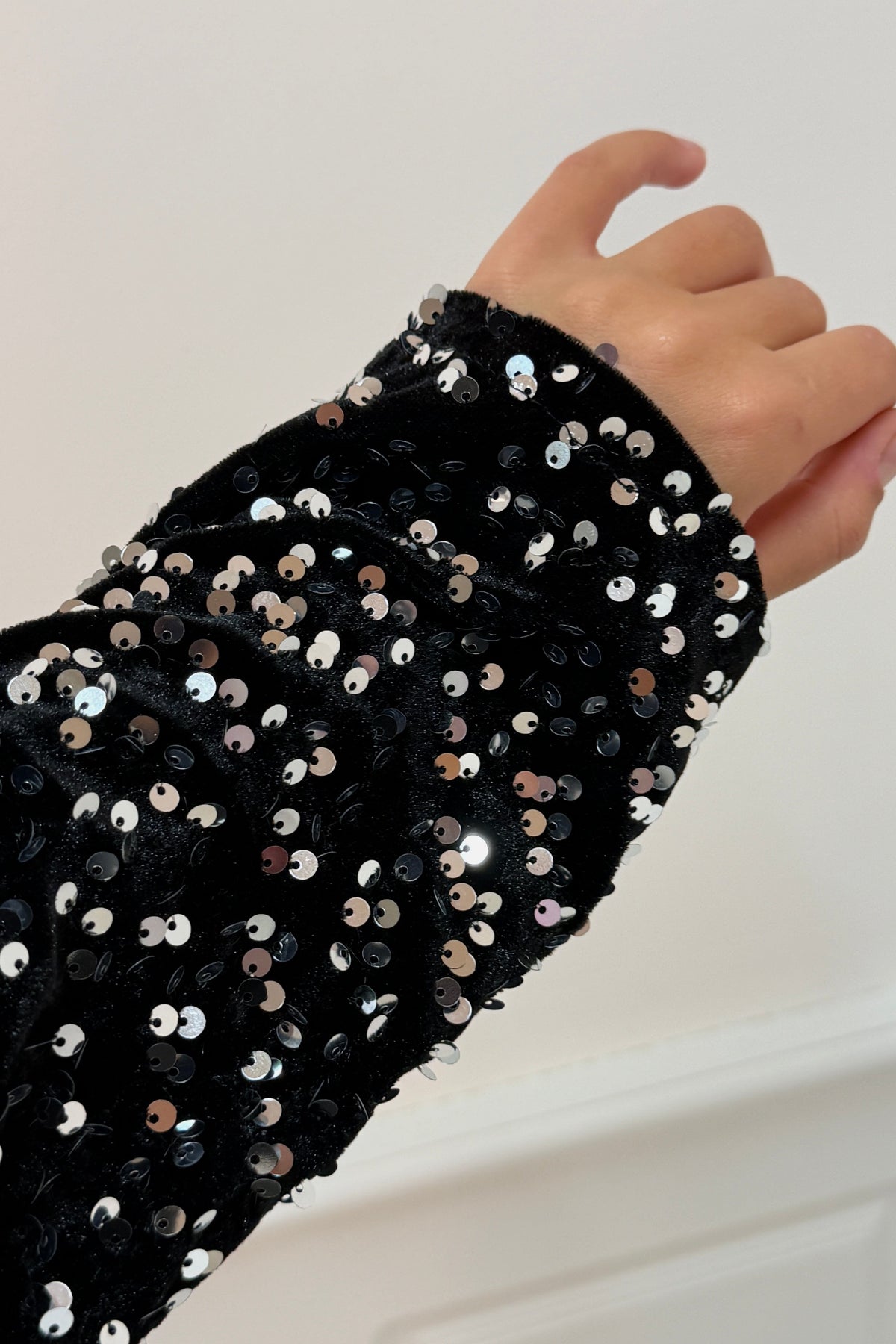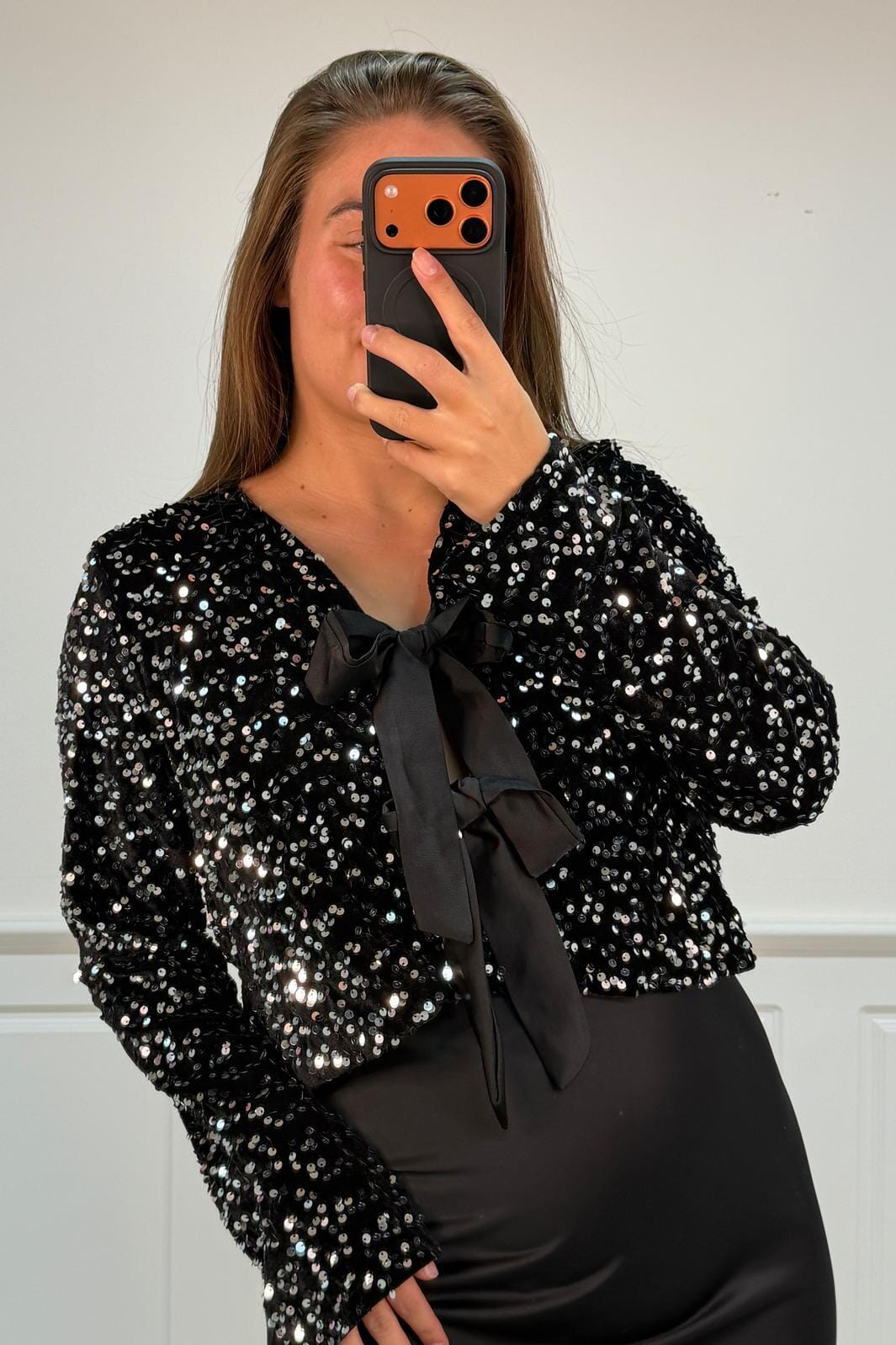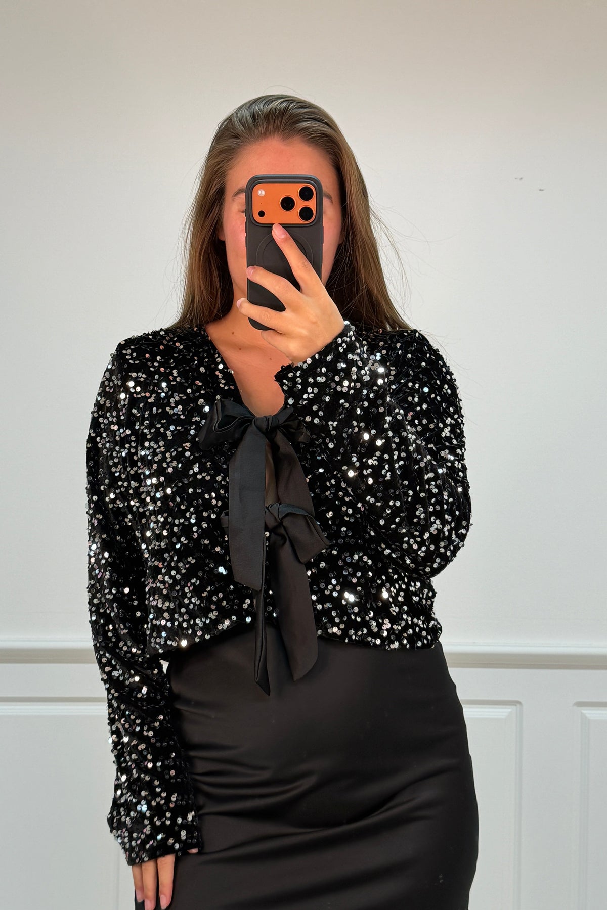 Sølvfarget bluse fra A-bee med paljetter over hele blusen. V-halsutskjæring med sløyfedetaljer og lange ermer gjør blusen velegnet til festlige anledninger.