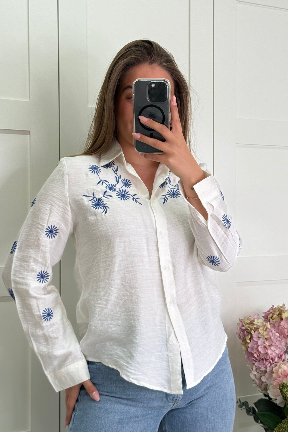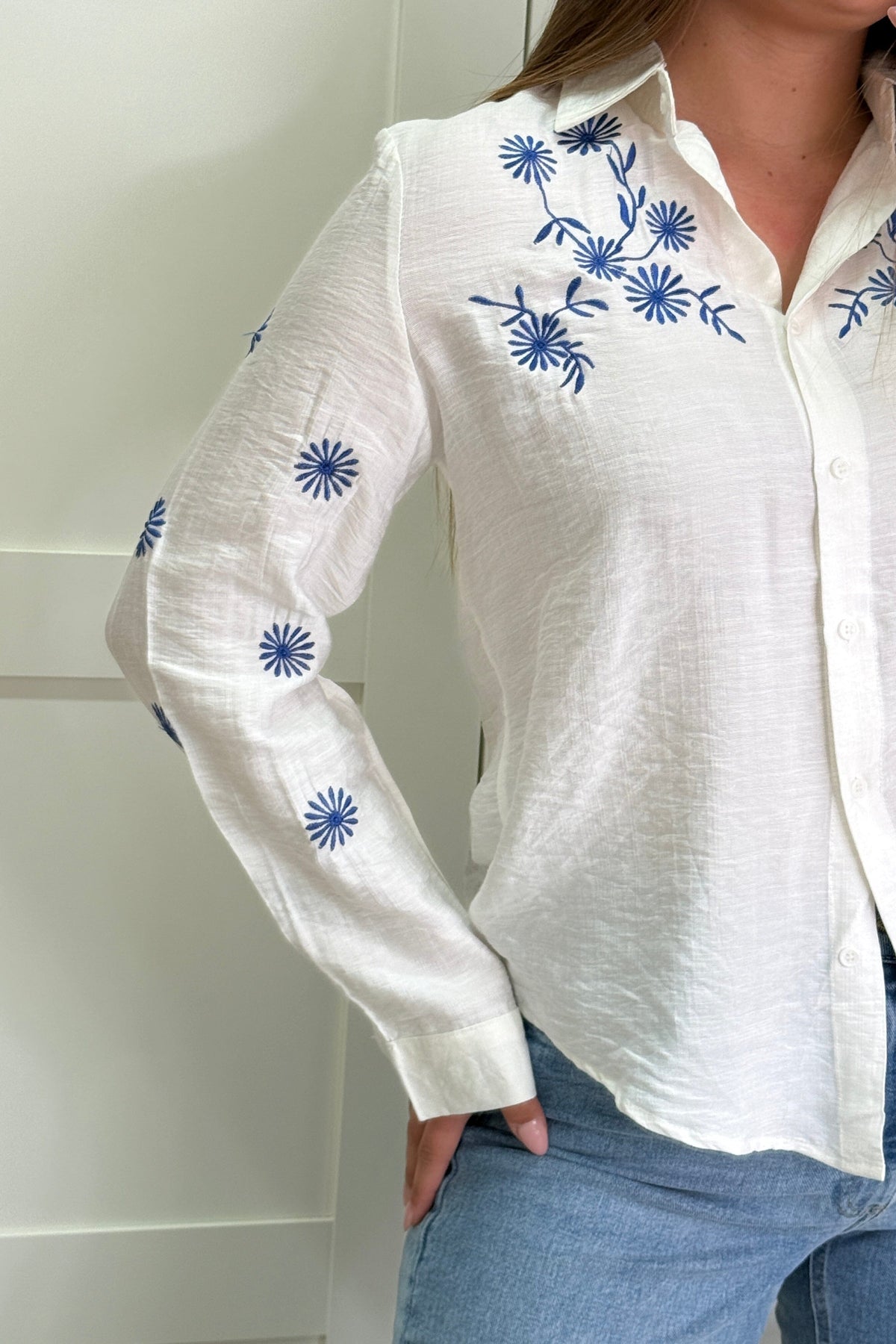 Hvit skjorte fra A-bee med blå blomsterbroderi på skuldrene og ermene. Skjorten har knapplukking og skjortekrage med en vanlig passform.
