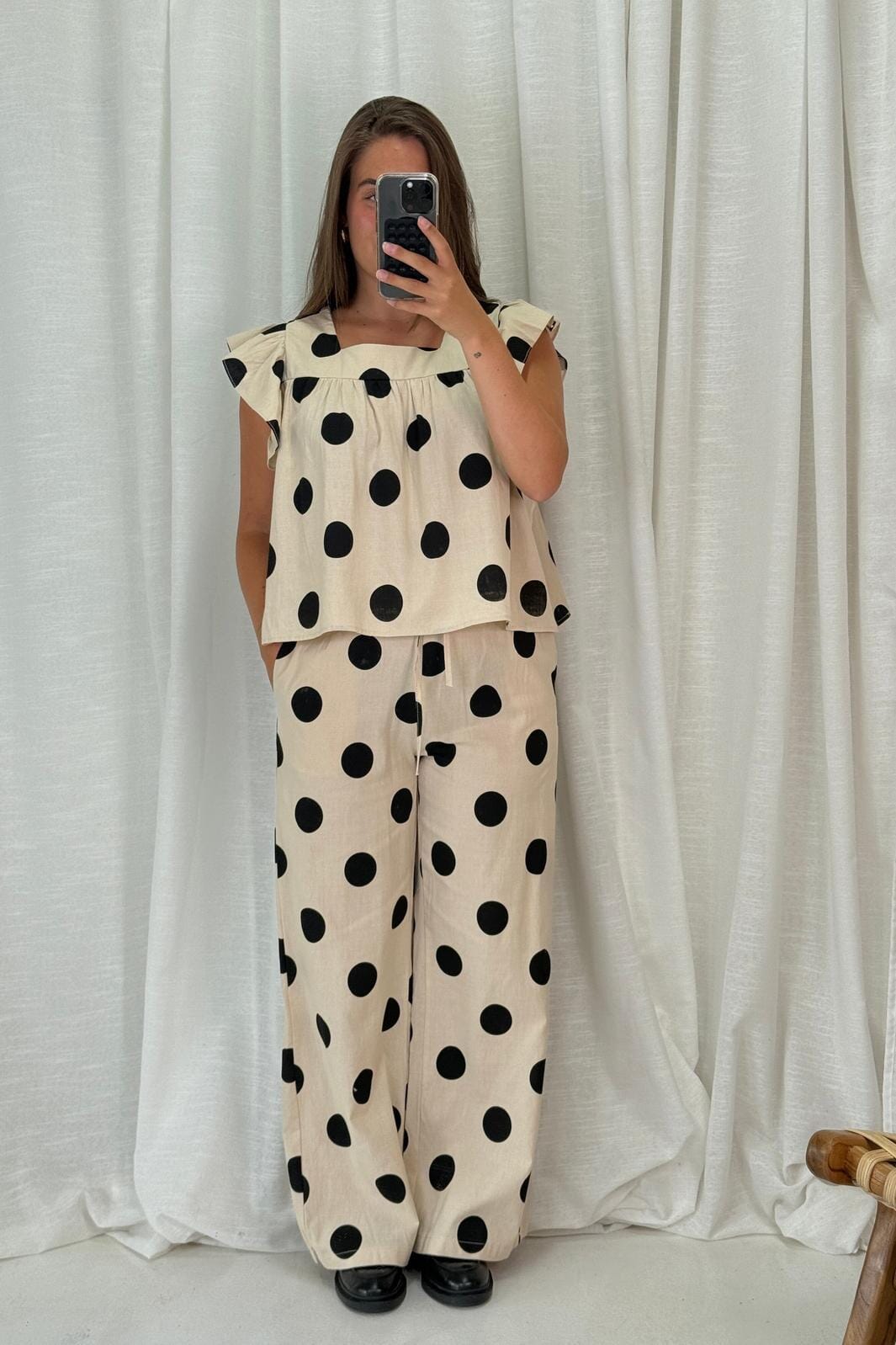 Bukser fra A-bee, laget av en blanding av bomull, viskose og lin i en lys ecru-nyanse. Disse buksene har et prikkete mønster med store svarte prikker.