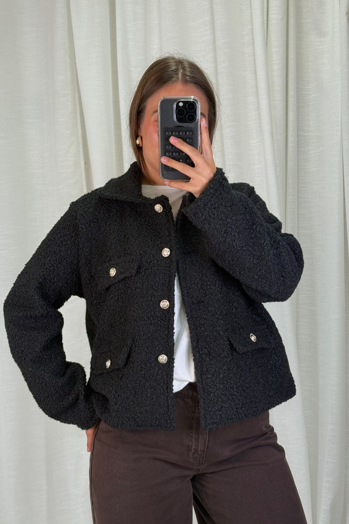 Sort jakke fra A-bee med en strukturert overflate. Jakken har skinnende knapper foran og to brystlommer med klaffer og knapper.