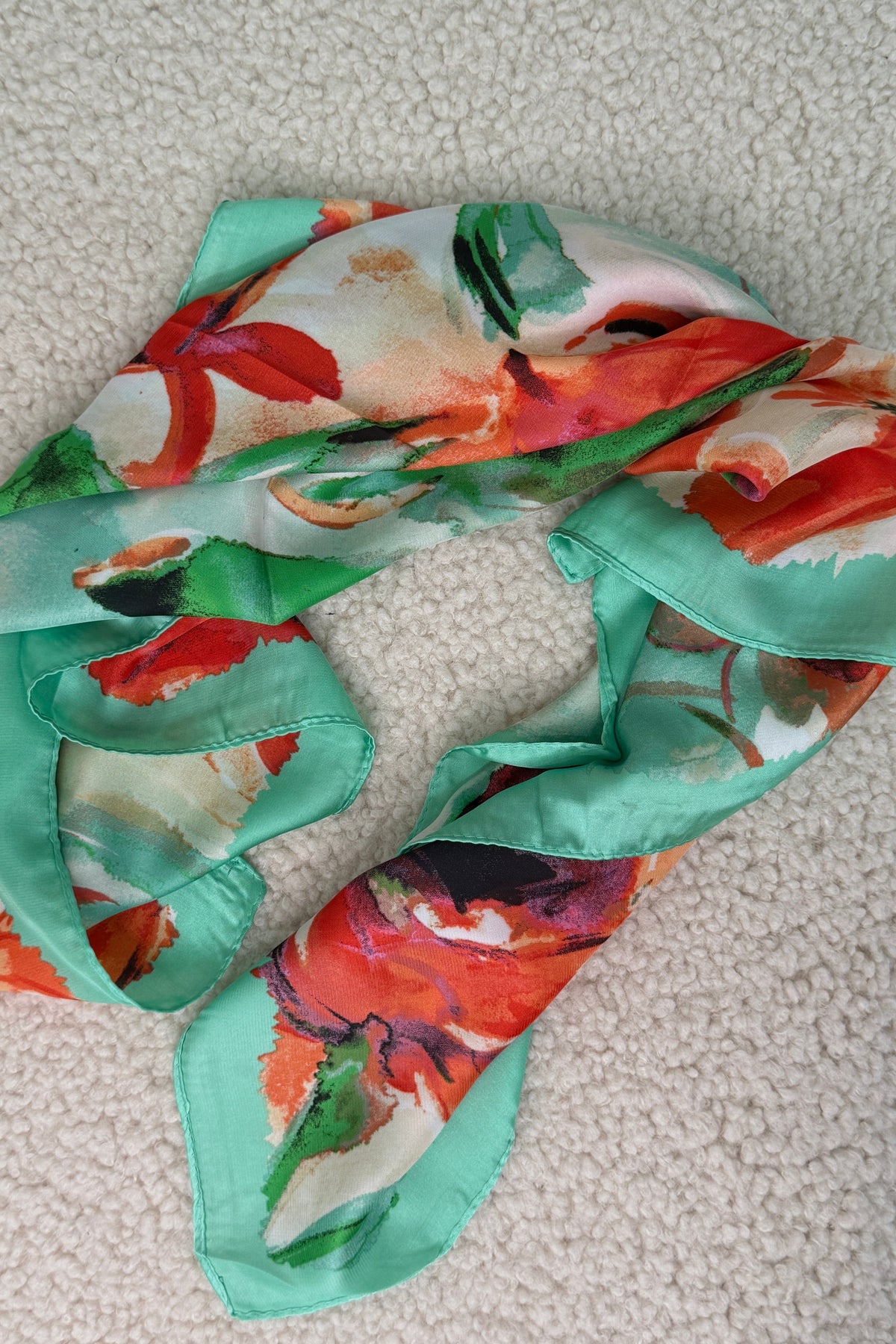 Grønt skjerf fra A-bee med et blomstret mønster i oransje, røde og grønne nyanser på en grønn bakgrunn.
