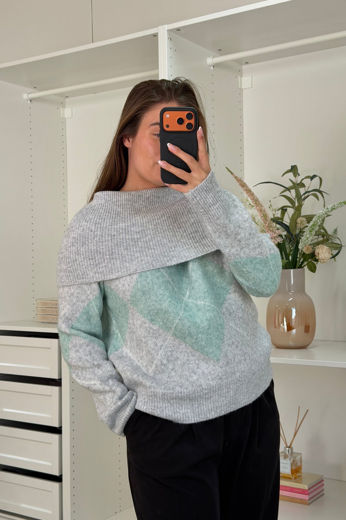 Strikkegenser fra A-bee i en kombinasjon av grå og grønn. Genseren har et rutet diamantmønster med melerte detaljer.