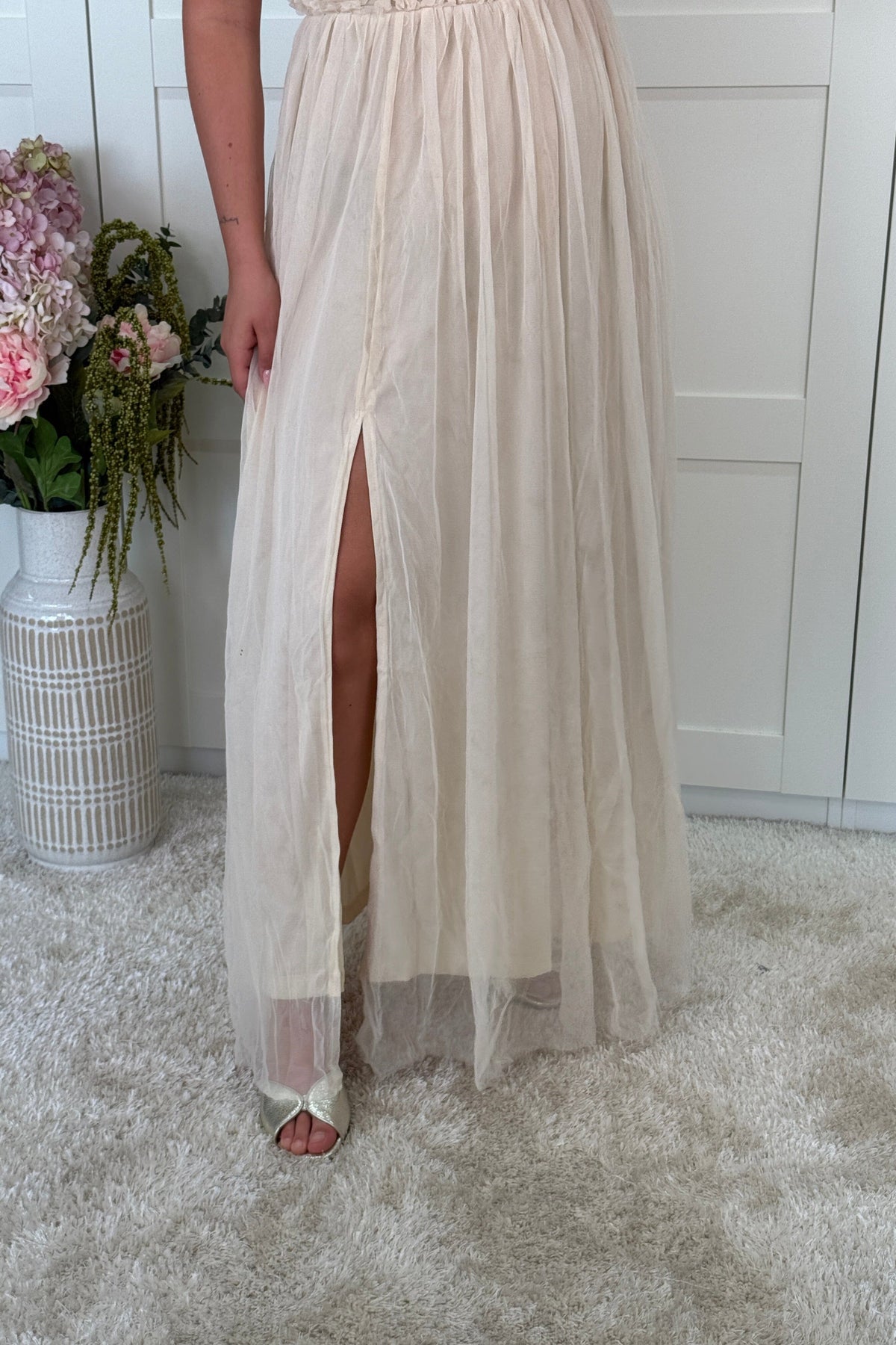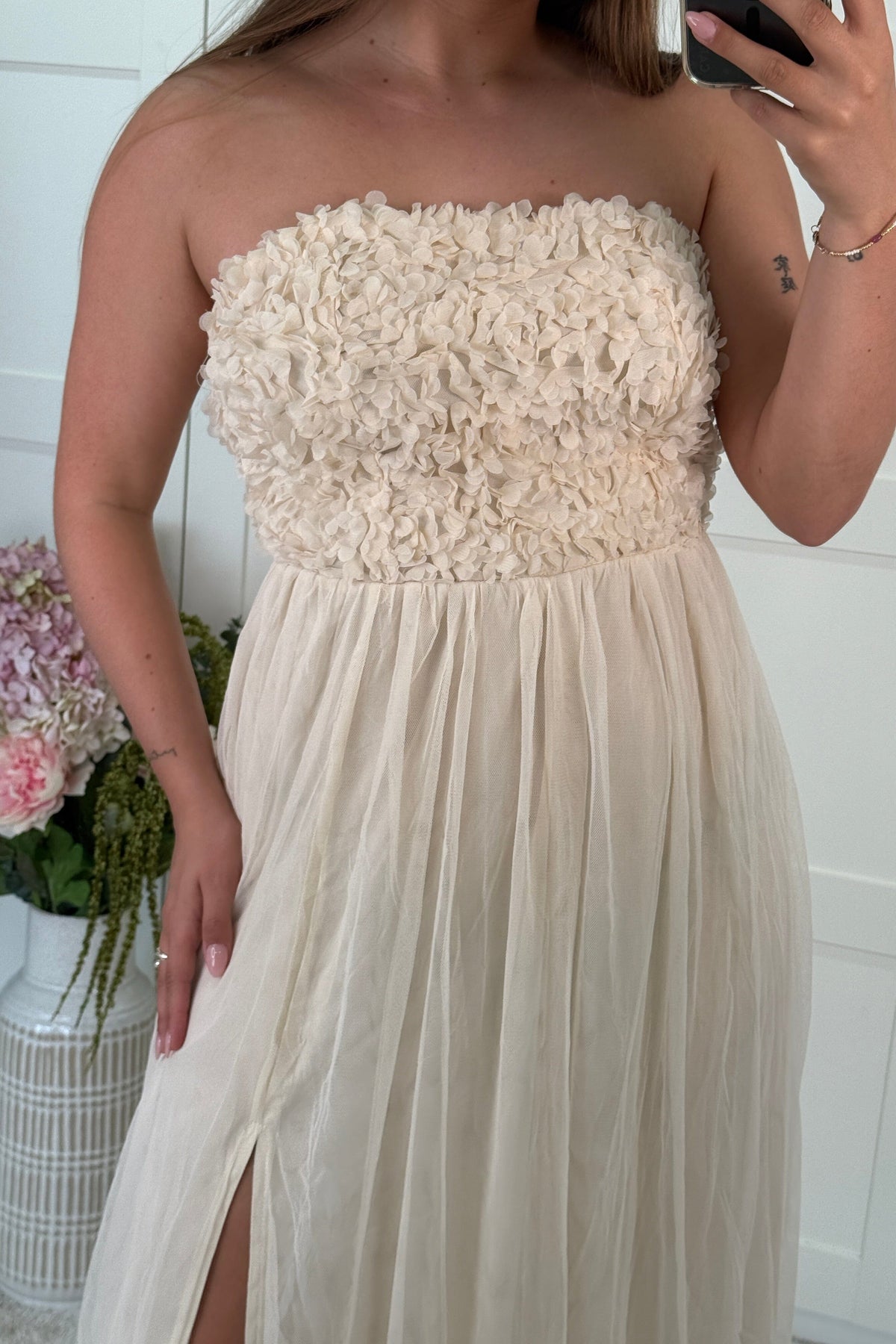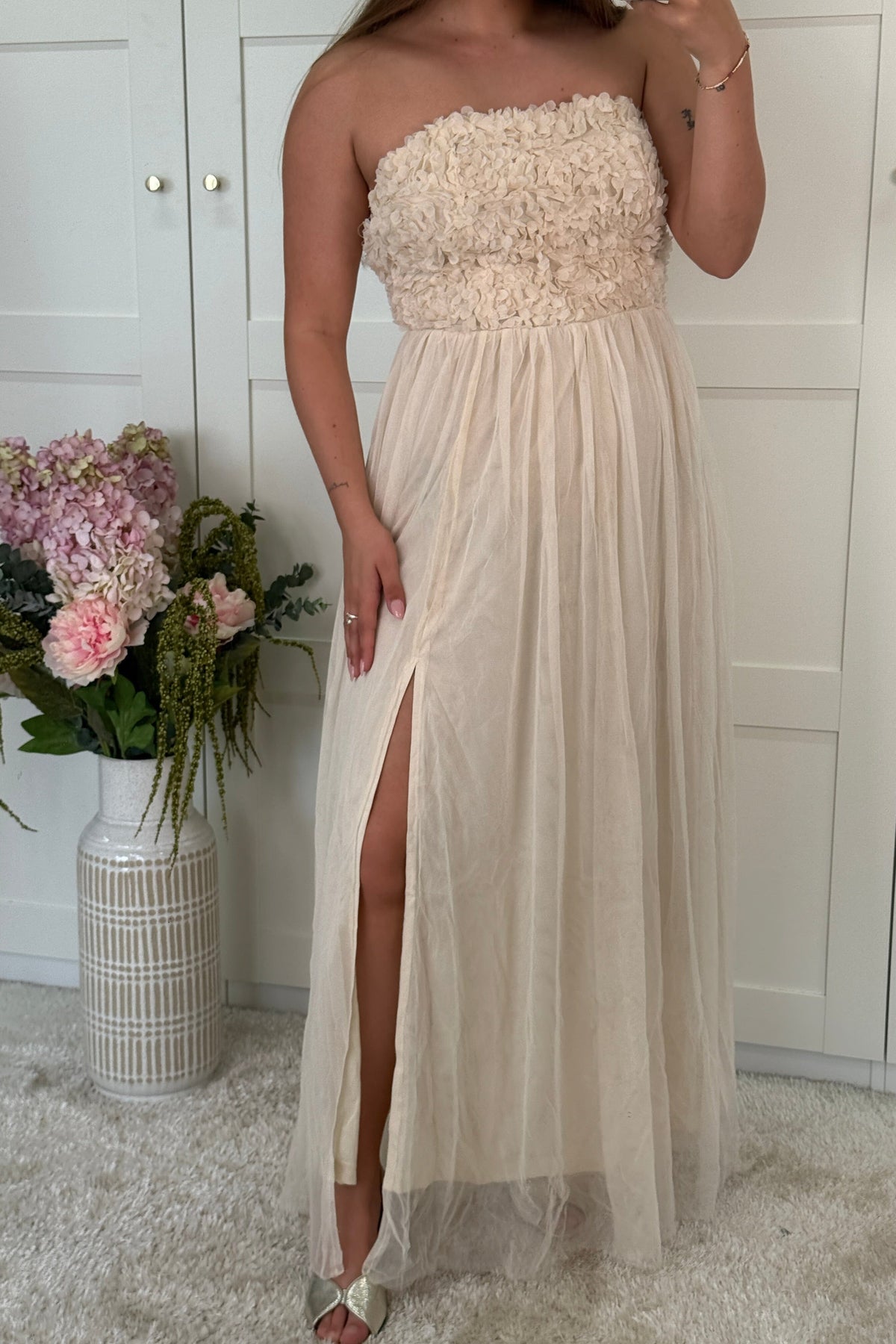 Kremfarget kjole fra A-bee med stroppeløs overdel og blomsterdetaljer. Den lange kjolen har en splitt i siden og er laget av lett, luftig stoff.