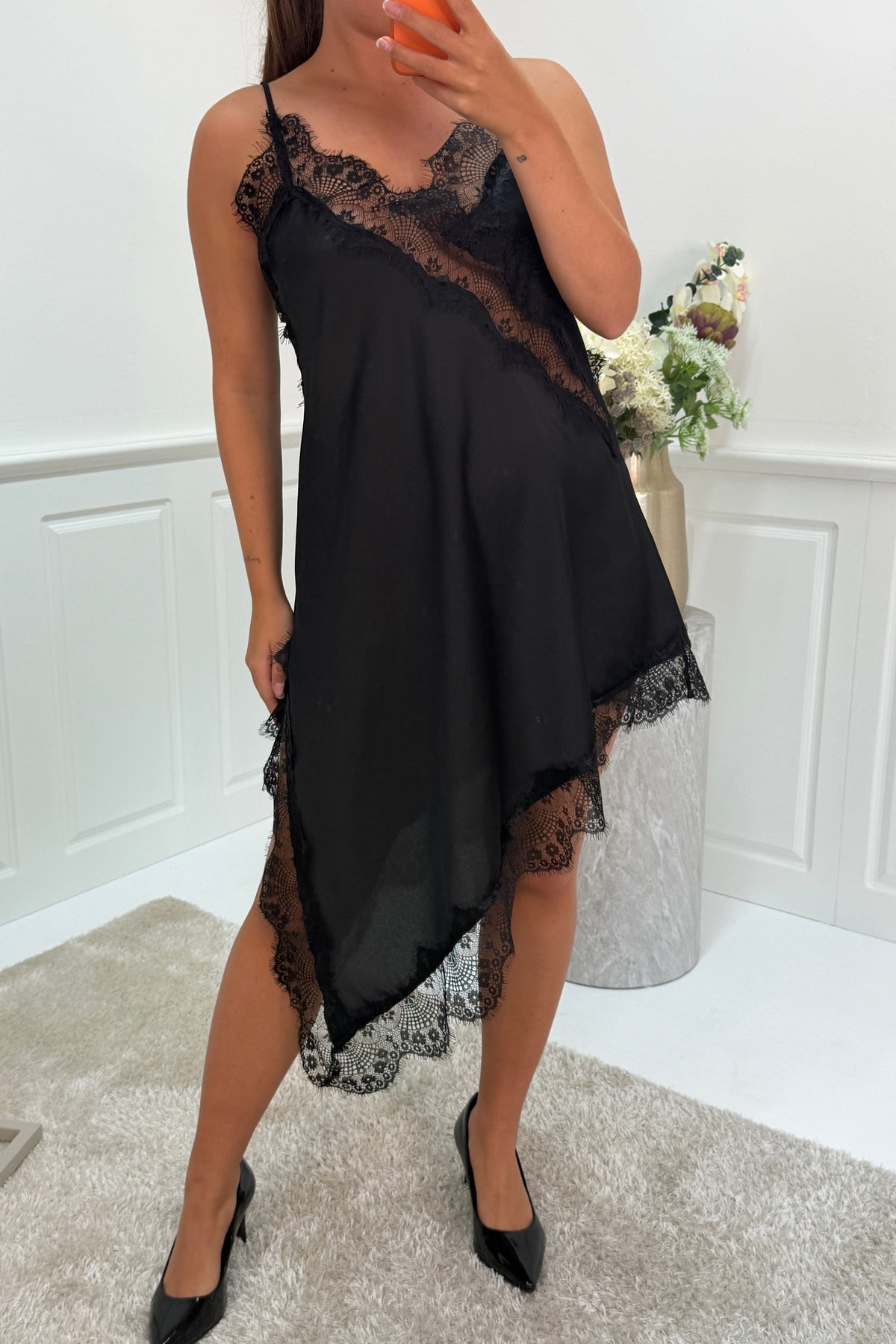 Svart festkjole fra A-bee med V-hals og asymmetrisk kant. Kjolen har blonde detaljer langs halsutskjæringen og kanten, som gir et fint uttrykk til designet.