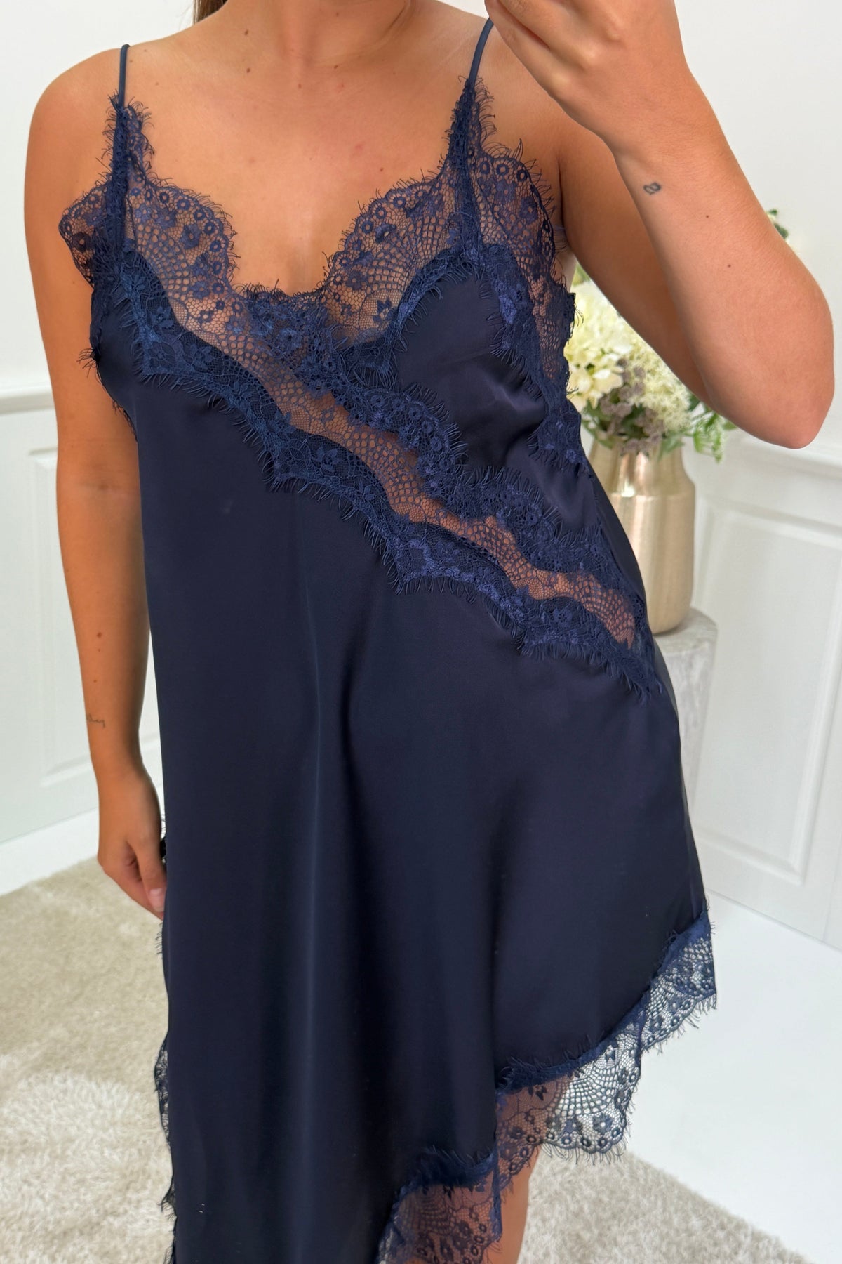 Mørkeblå kjole fra A-bee med løs passform og asymmetrisk kant. Kjolen har blondedetaljer ved halsutskjæringen og langs kanten, samt tynne stropper og en V-utskjæring.