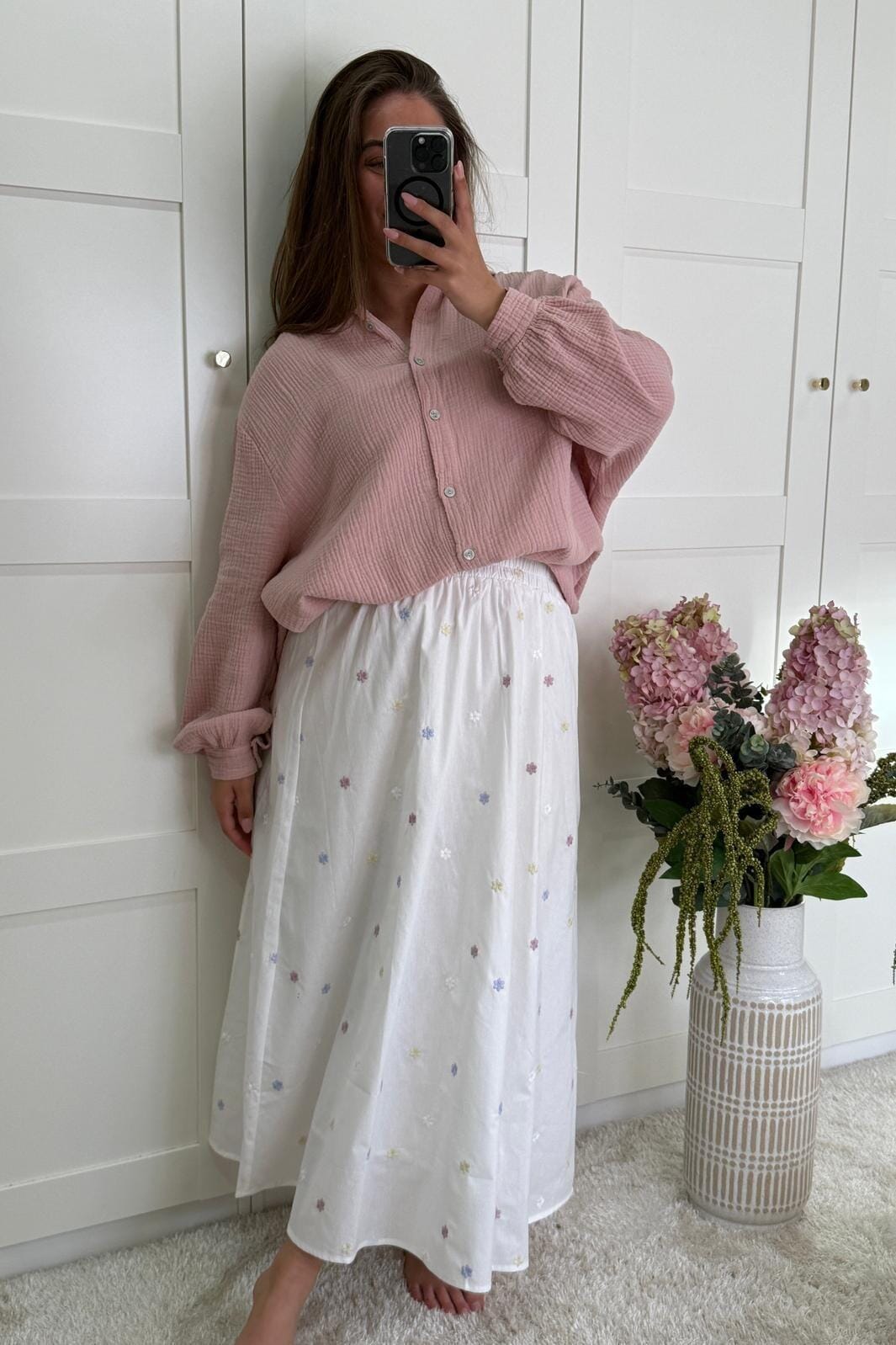 Hvit skjørt fra A-bee med broderte blomster i lilla, gul og rosa. Den har en løs passform og kne-lengde som gjør den anvendelig til både hverdag og fest.