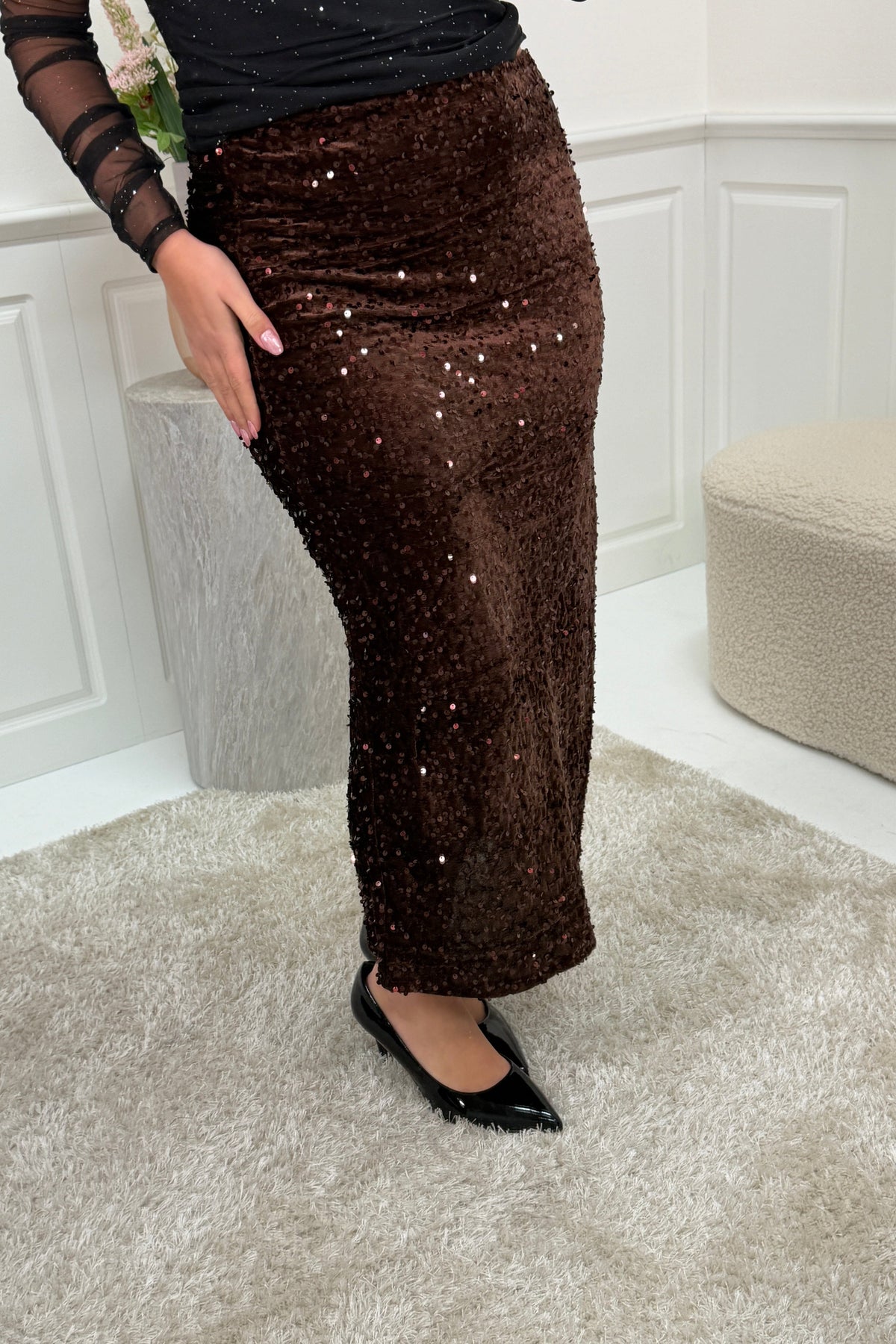 Skjørt fra A-bee i mørk bordeaux, dekket med paljetter over hele overflaten. Den høye midjen og den smale passformen går ned til anklene.
