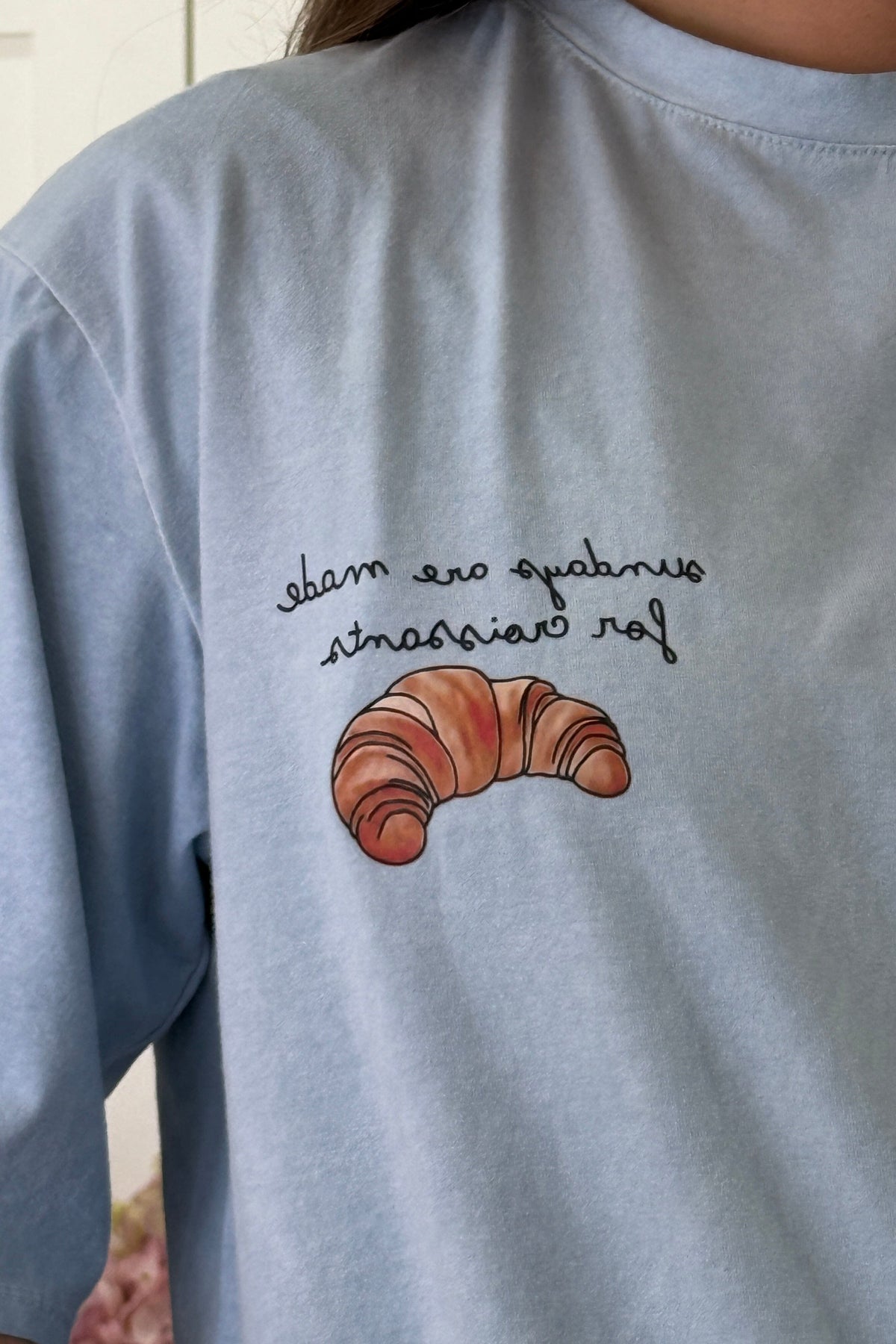 Lys blå t-skjorte fra A-bee med en morsom croissant-illustrasjon på venstre bryst. T-skjorten har rund halsutringning og korte ermer samt en behagelig passform.