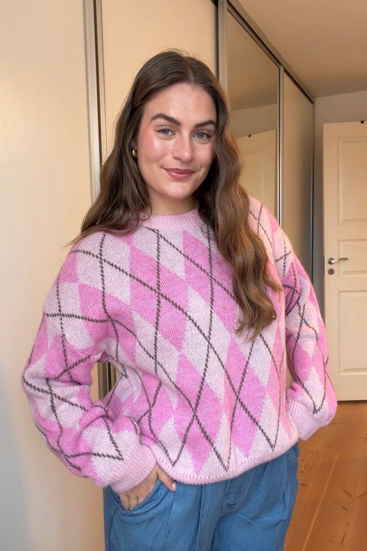 Strikkegenser fra A-bee i rosa og lilla nyanser med et rutet argyle-mønster. Genseren har en løs passform og lange ermer.