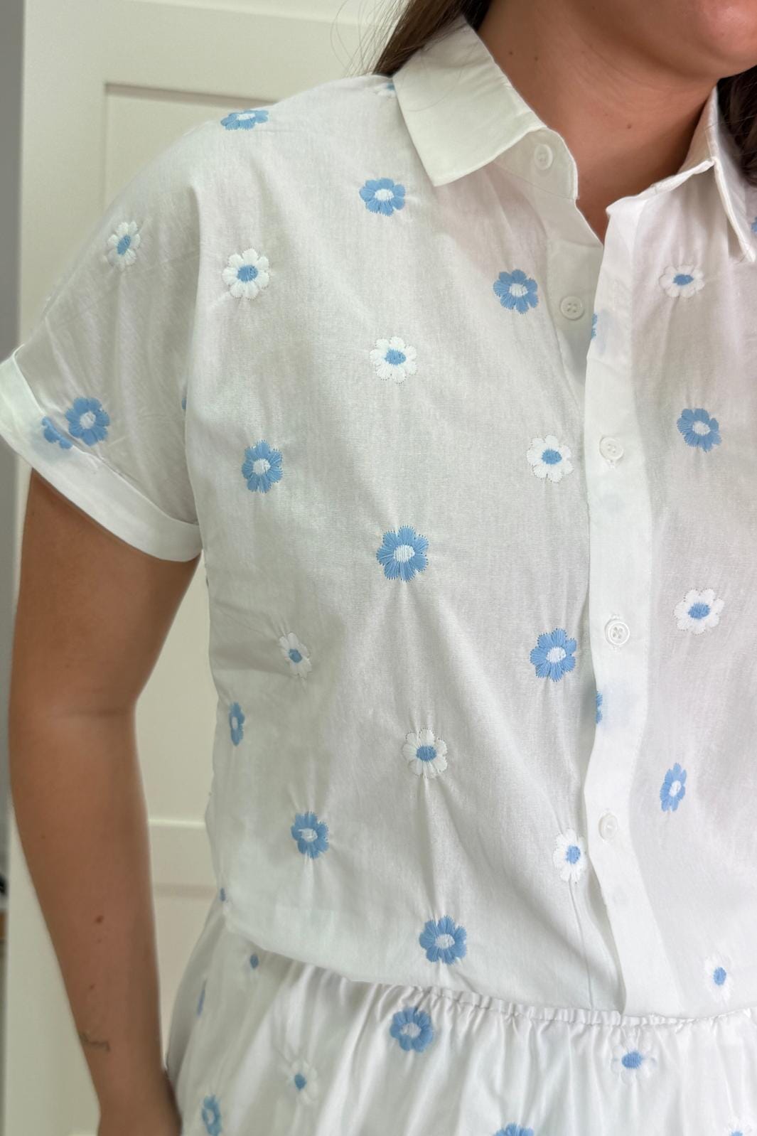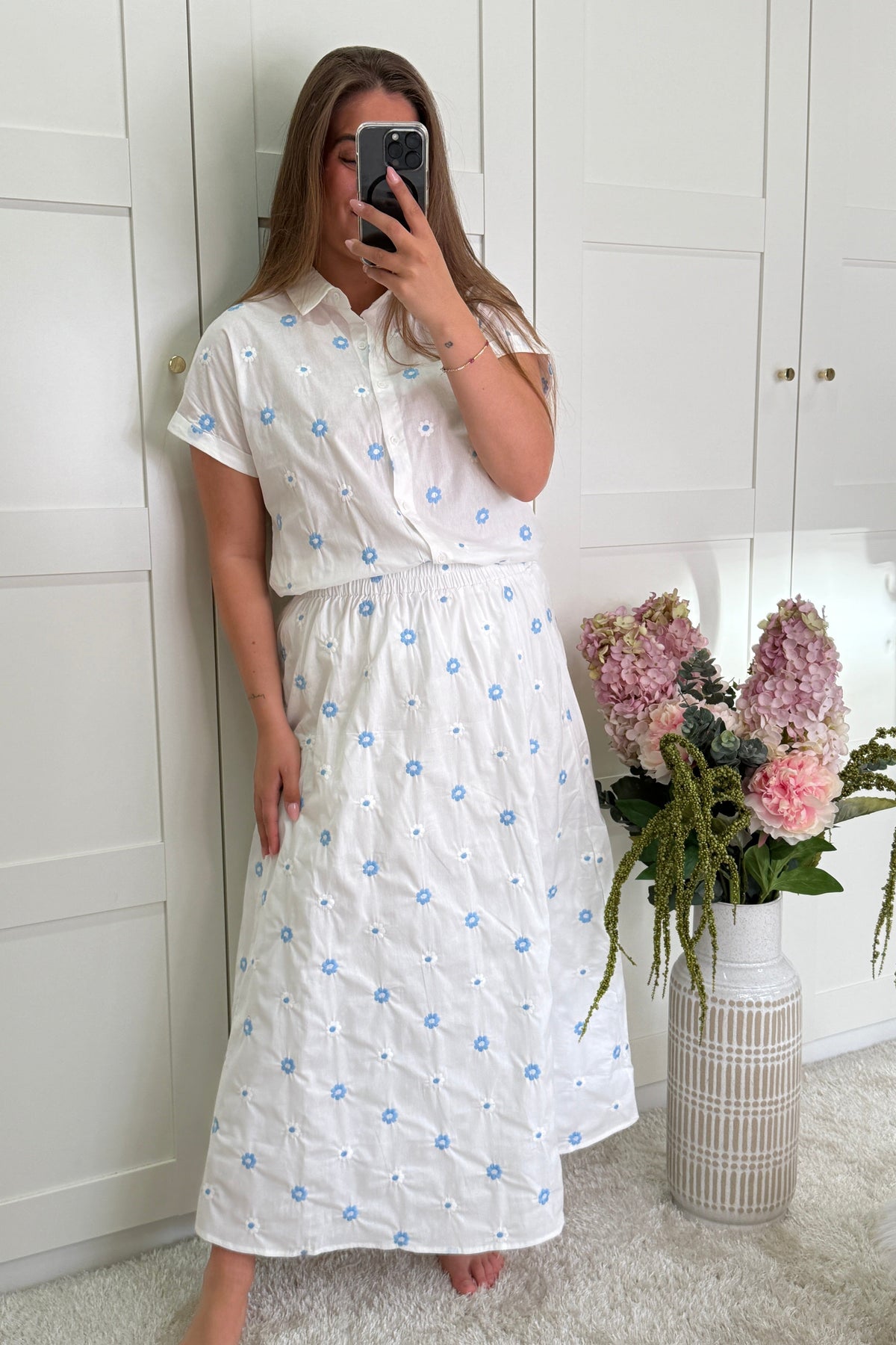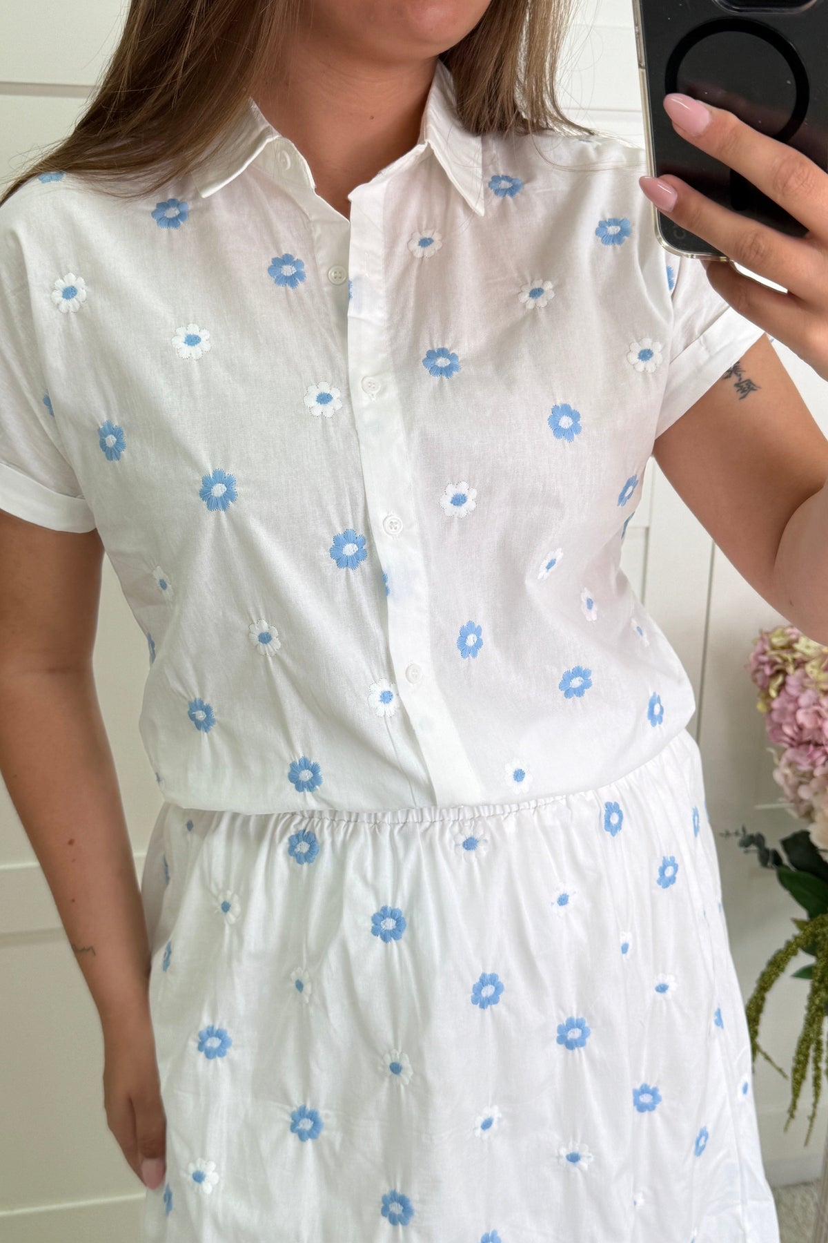 Hvit skjorte fra A-bee med lyseblå blomsterbroderi. Skjorten har en klassisk skjortekrage, korte ermer og en elastisk midje som gir en god passform.