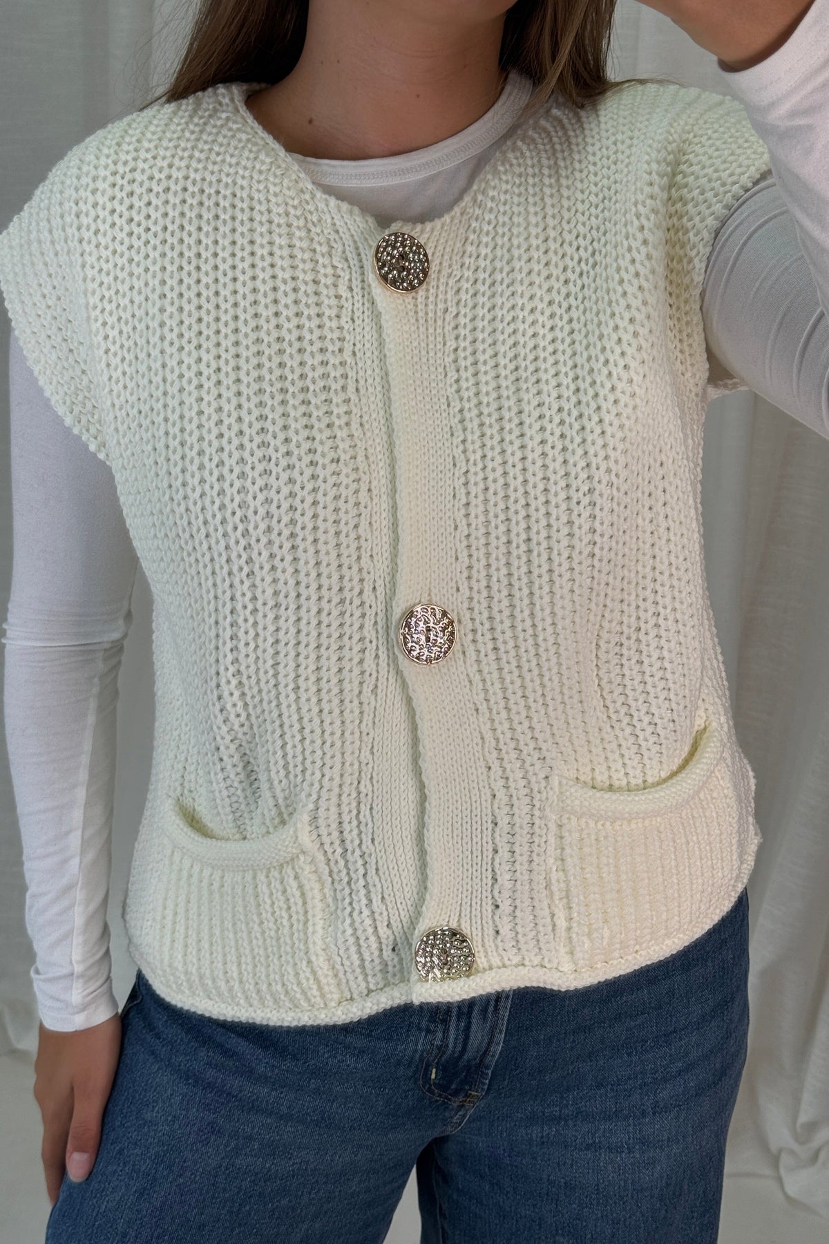 Hvit vest fra A-bee, strikket i akryl med knapper foran. Vesten har rund halsutringning og er ermeløs med en regular fit.