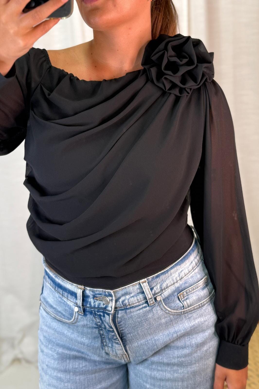 Sort bodystocking fra A-bee med asymmetrisk halsutringning og draperinger. Den passer til formelle arrangementer og festlige anledninger.