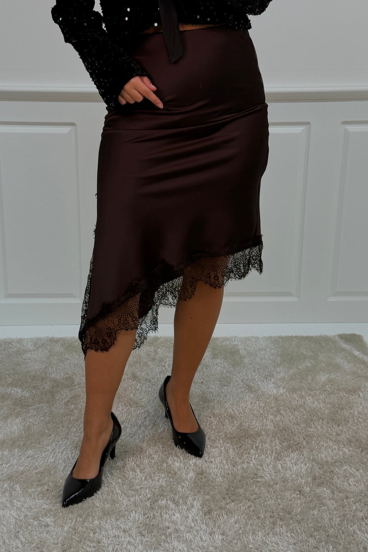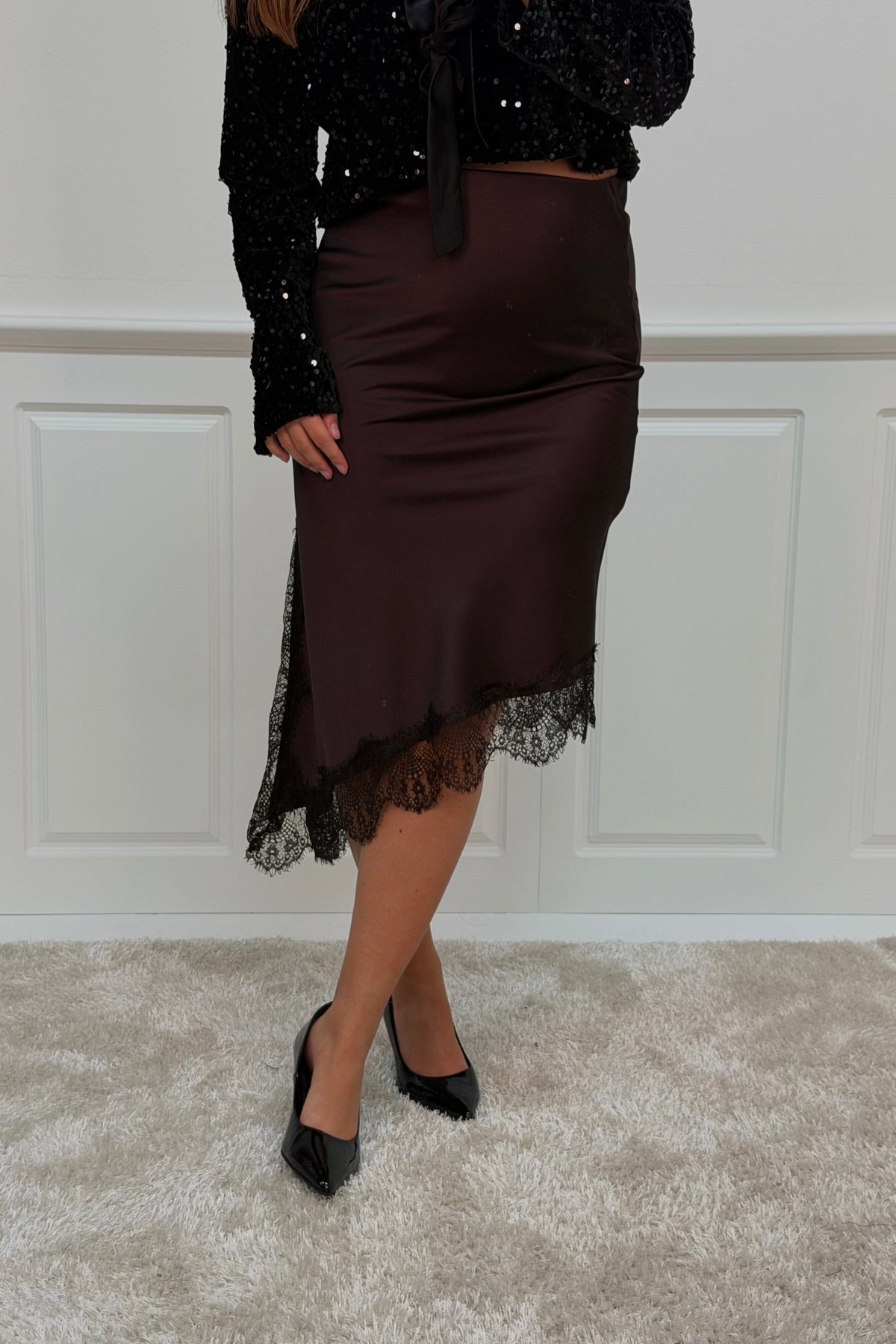 Brun skjørt fra A-bee med blondedetaljer langs kanten. Skjørtet er laget i viskose og har en lengde til leggen med vanlig midjehøyde.