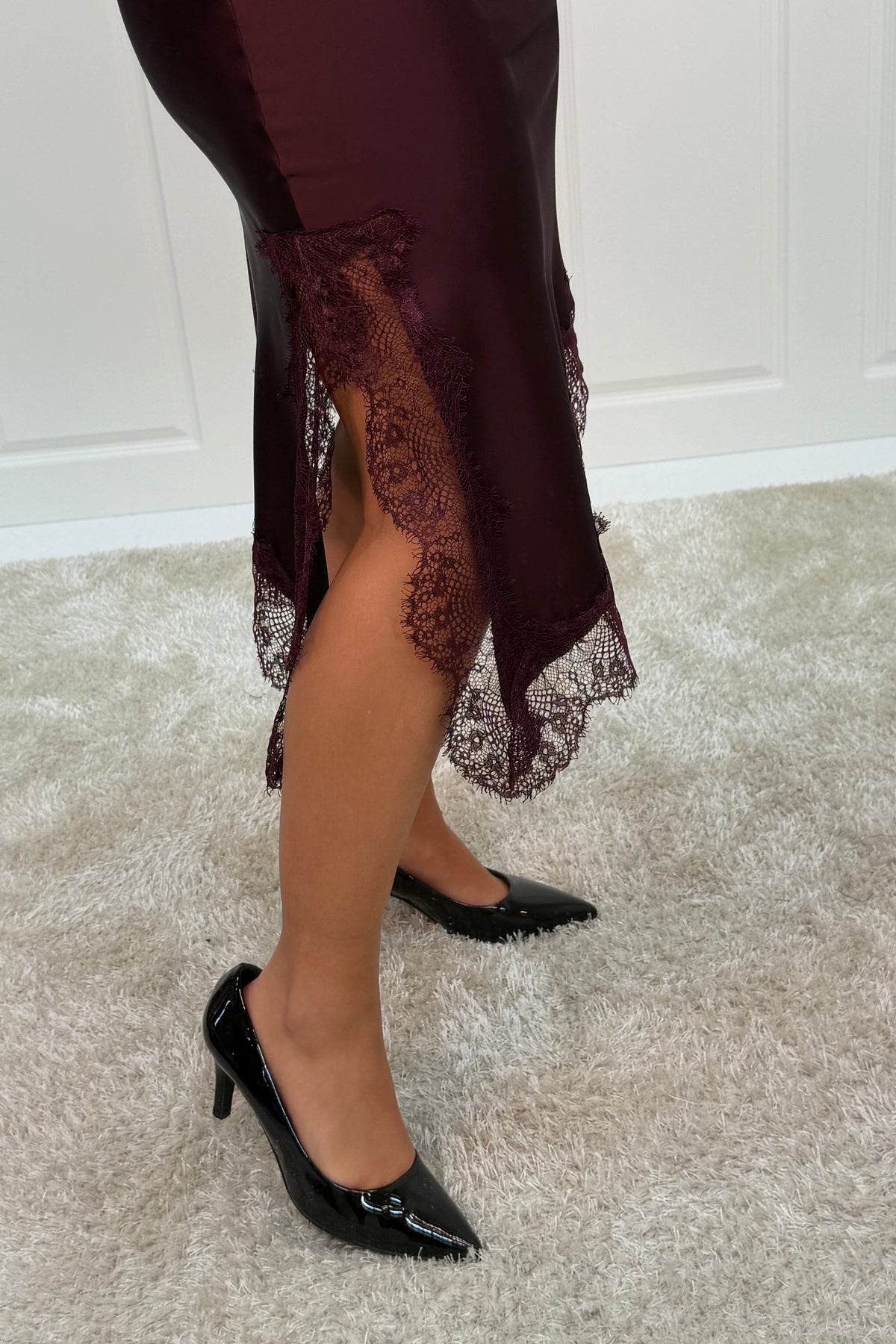 Plommefarget skjørt fra A-bee med blondedetaljer langs kanten. Skjørtet har en lengde til midt på leggen og en glatt overflate med skinnende finish.