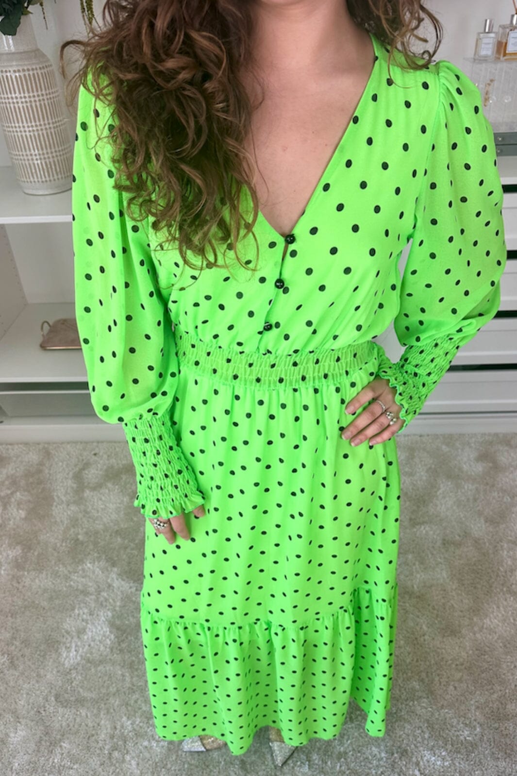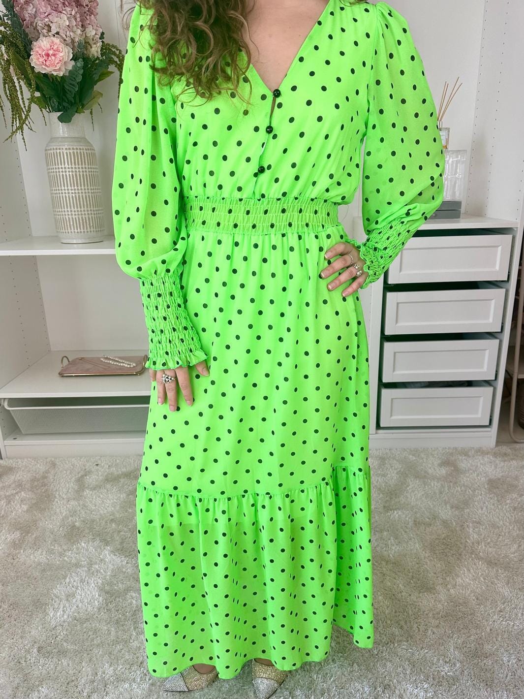 Kjole fra A-bee i en klar grønn farge med svarte prikker. Kjolen har smock-liv, V-hals og lange ermer med rynkede mansjetter. Skjørtet går til leggene.
