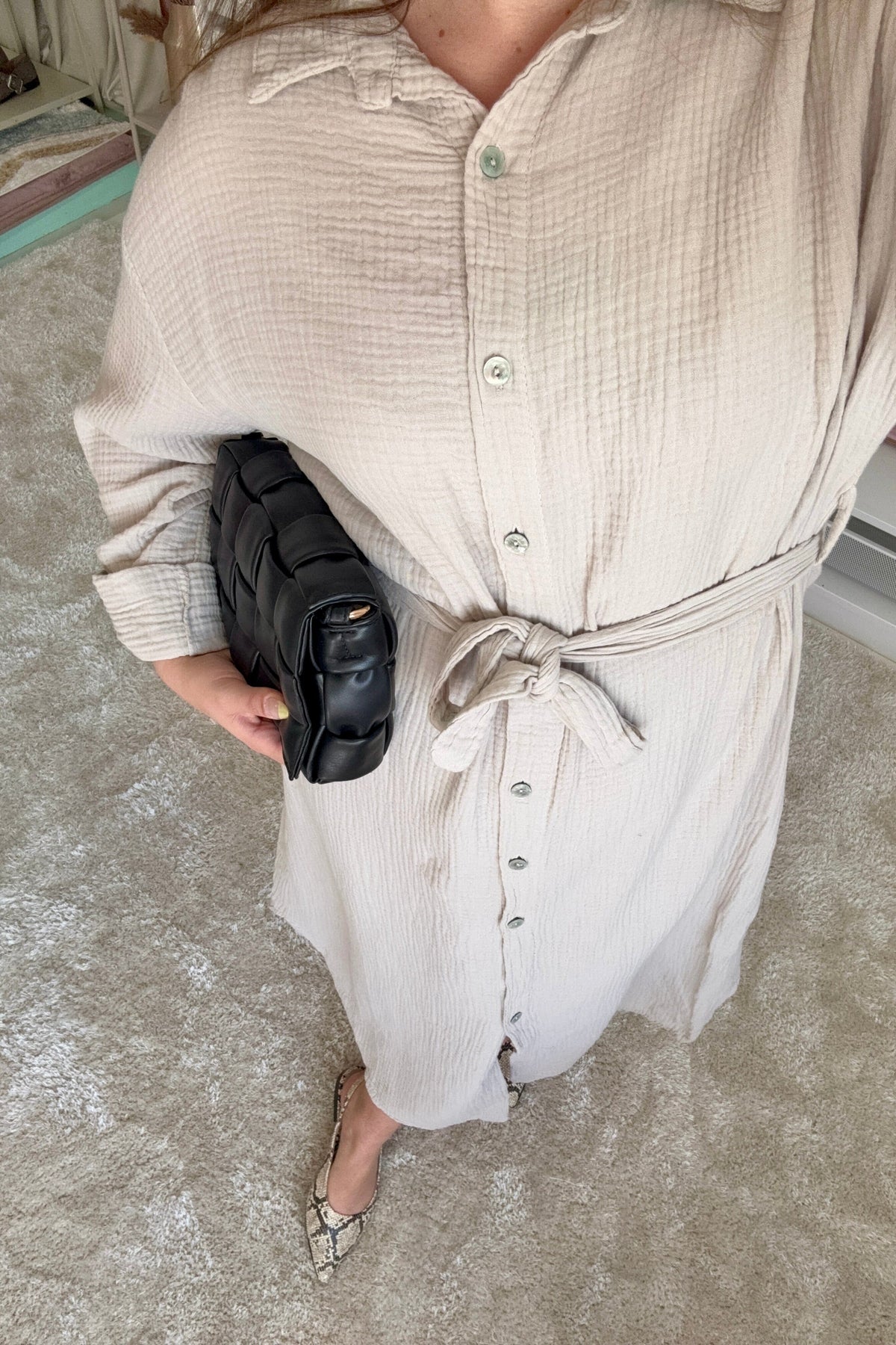 Beige skjortekjole fra A-bee i lett bomullskvalitet. Den lange kjolen har knapper hele veien ned og et bindebånd i livet for å justere passformen.