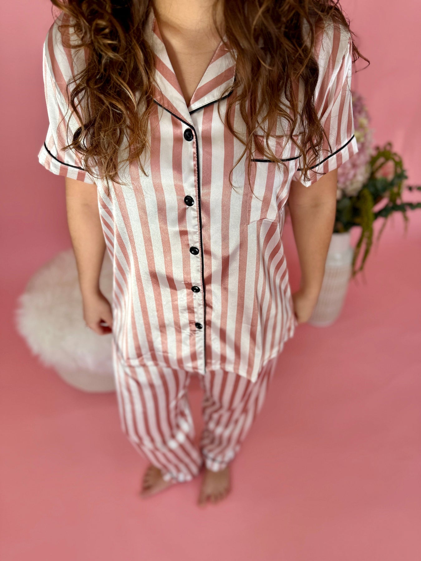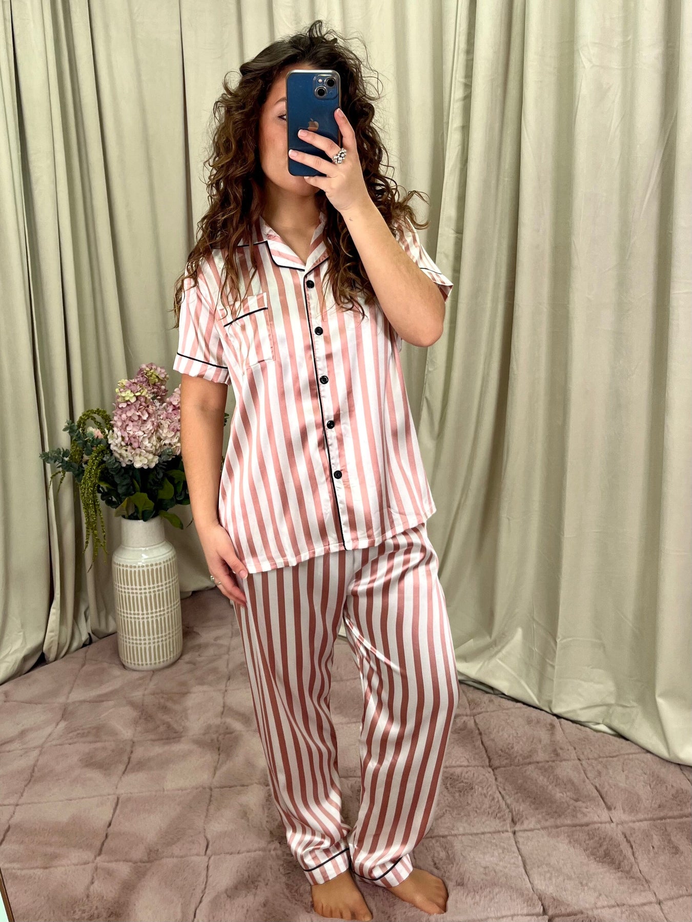 Beige stripete pysjamas fra A-bee med skjortekrage og knapper foran. Sett har en slim fit og ankel lengde med svart piping langs kantene.