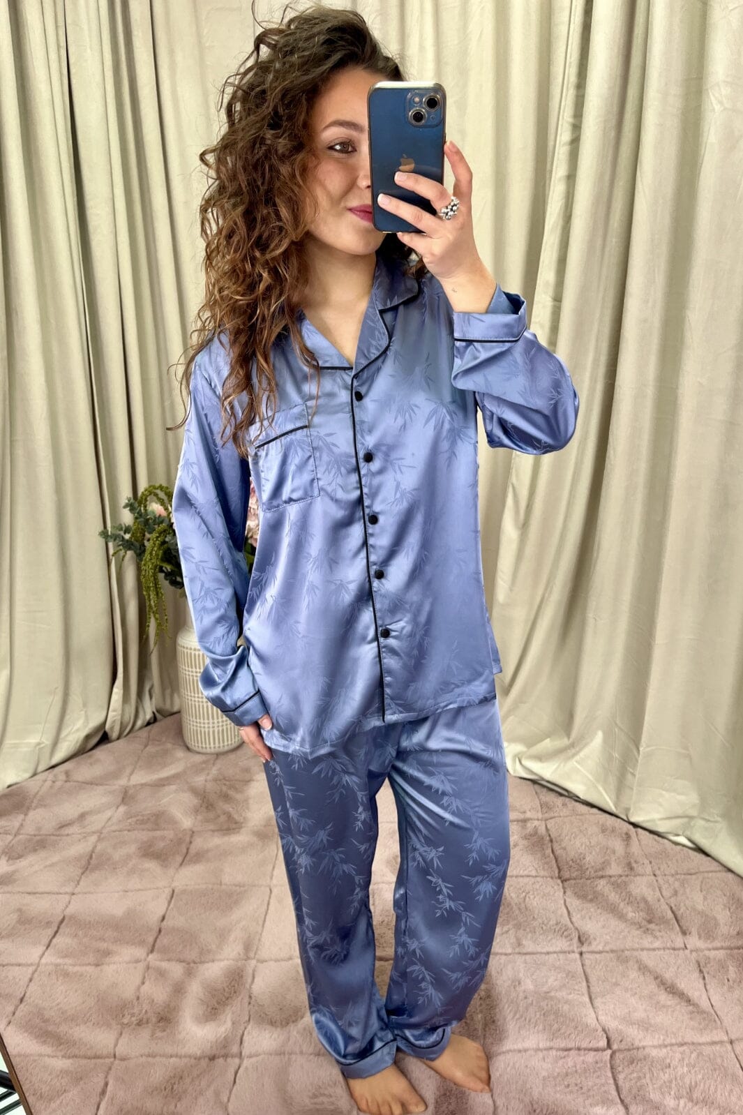 Blå pysjamas fra A-bee med bambusblad-mønster og svart kantbånd. Sett består av en skjorte med brystlomme og matchende bukser i et skinnende stoff.