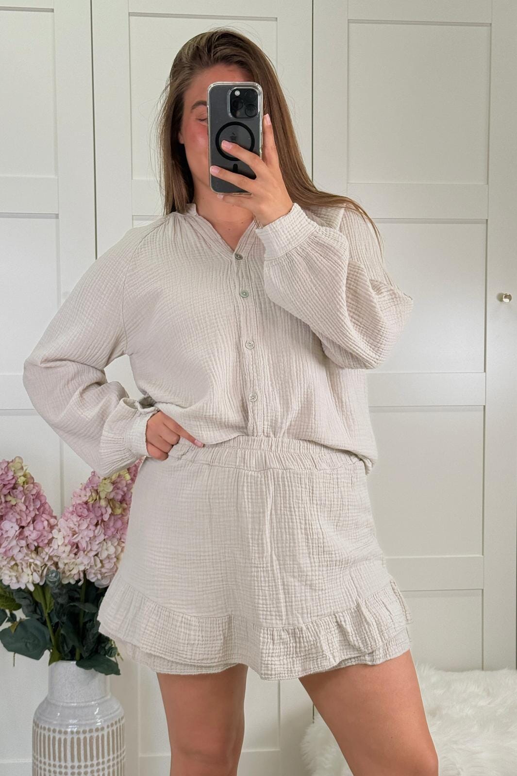 Beige shorts fra A-bee med volangkant. Shortsene er laget av en lys beige bomull med en myk tekstur og har en avslappet passform.