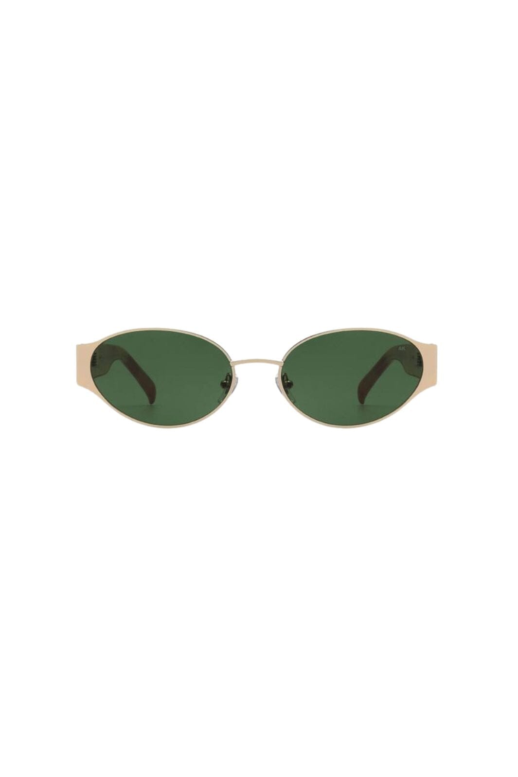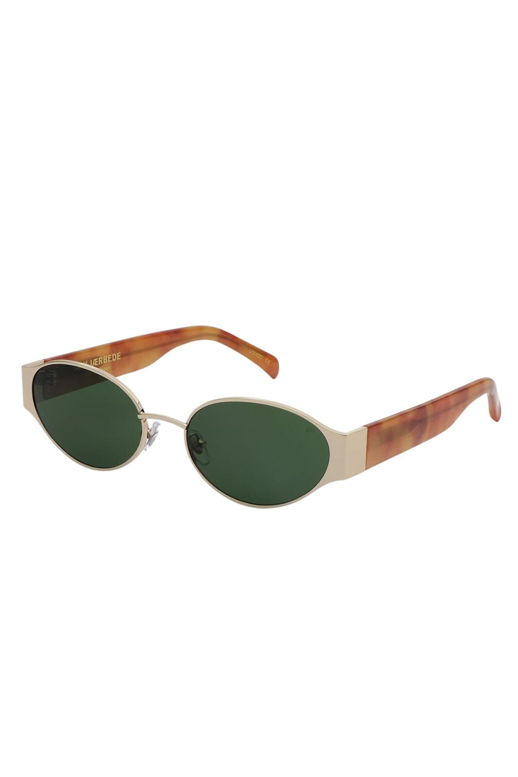 Solbriller fra A. Kjærbede med ovale linser og gyllent stel i metall. Den grønne fargetonen i linsene gir solbrillene et dempet uttrykk, og stellet har en tynn bro på 18 mm.
