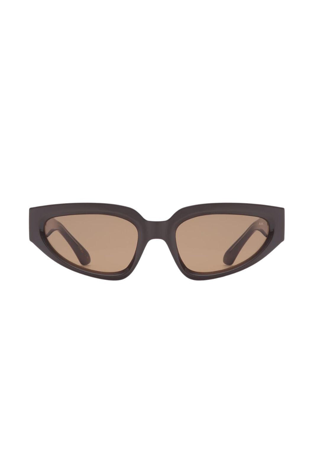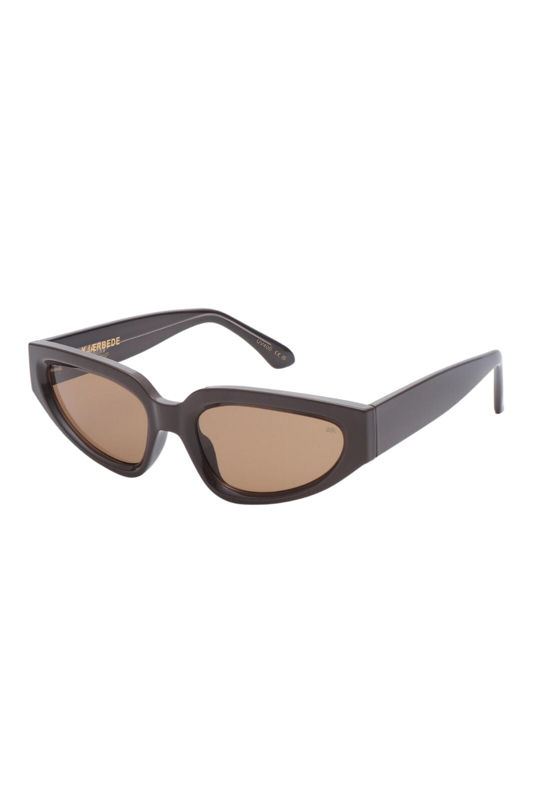 Solbriller fra A. Kjærbede i en mørk sjokoladefarge. Innfatningen har en cat-eye-form med smale, ovale linser og en oppadgående ramme, som gir et retro preg.