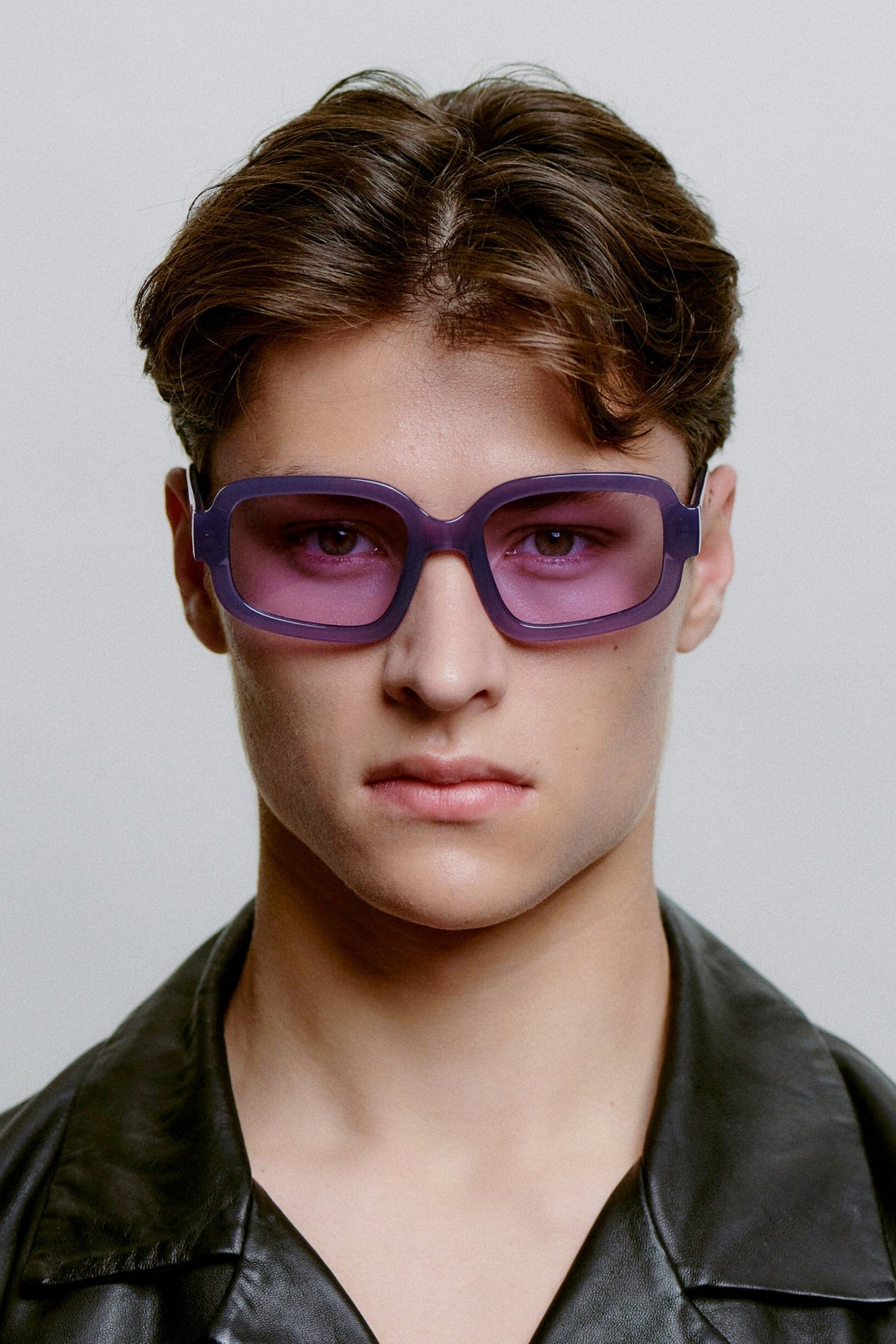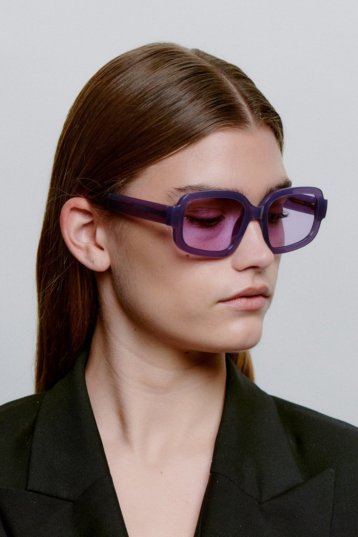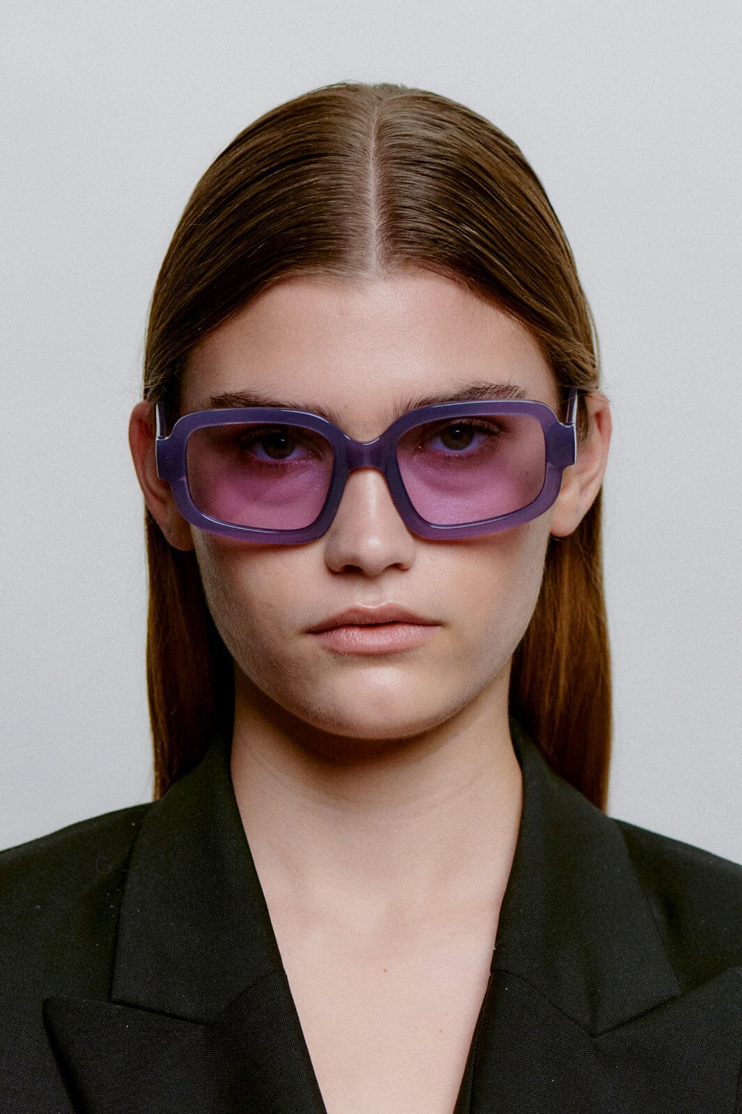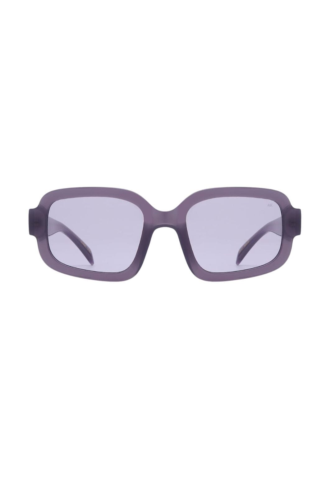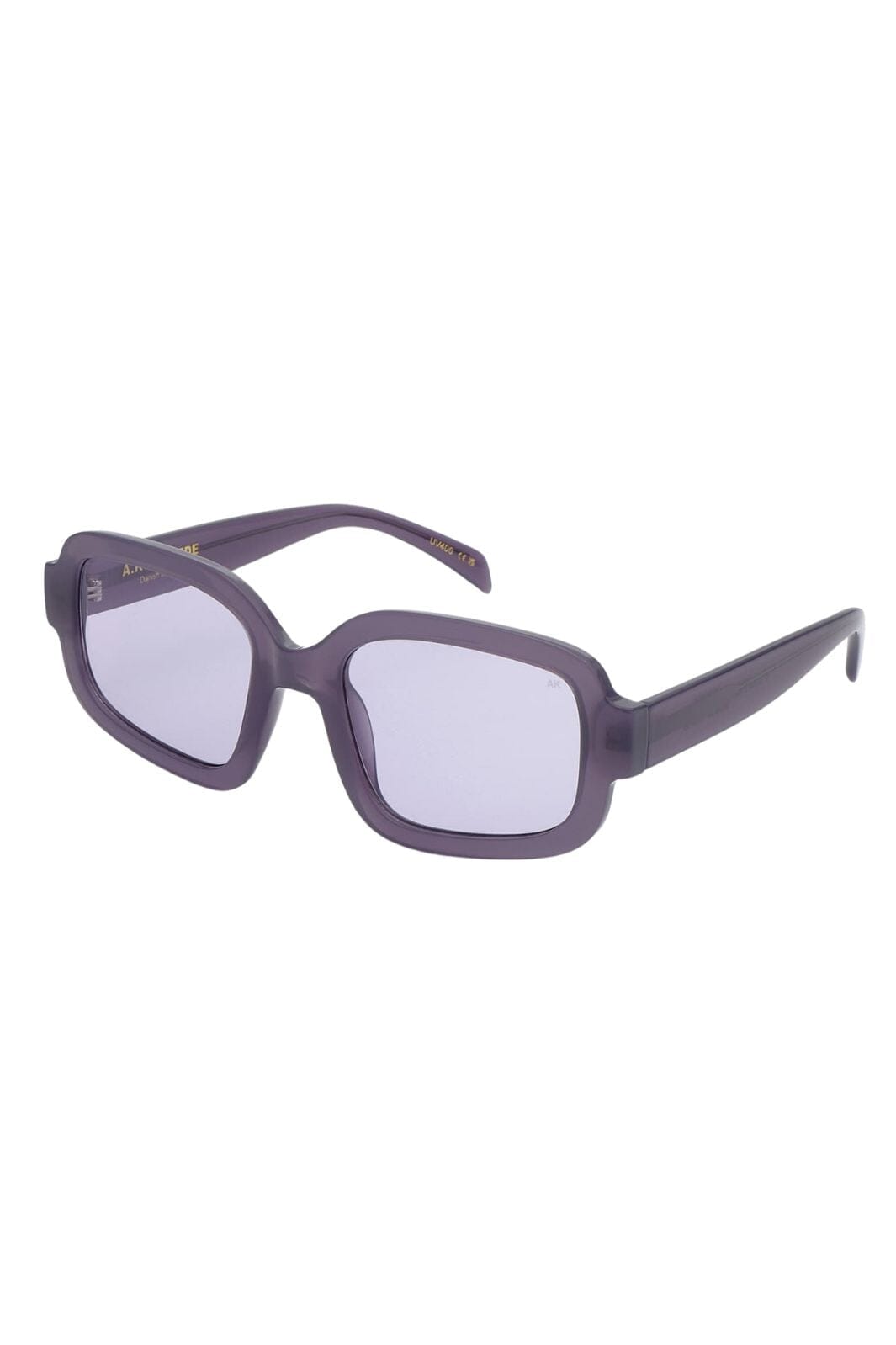 Solbriller fra A. Kjærbede med rektangulær innfatning i lilla nyanser. Innfatningen har en kraftig ramme med tonede linser og myke kurver i designet.
