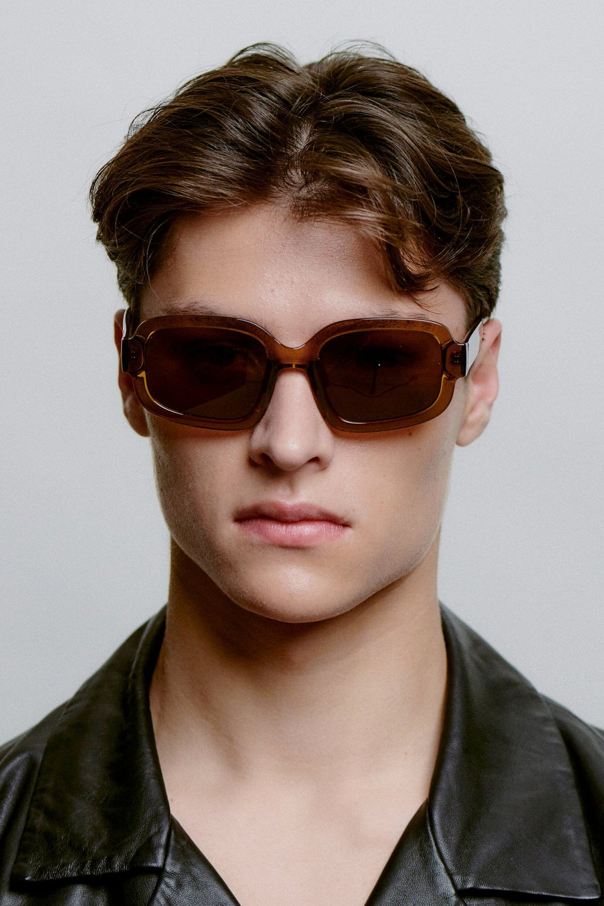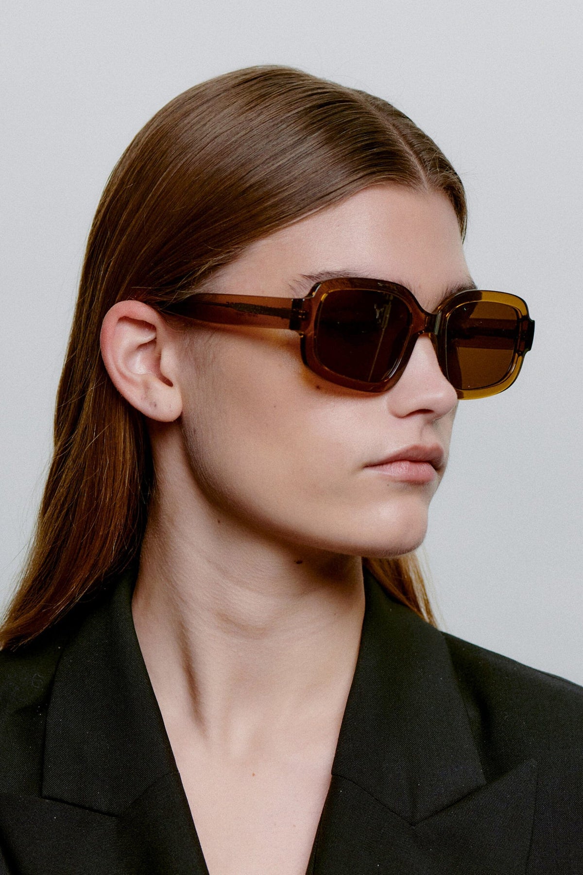 Oversized solbriller fra A. Kjærbede med kraftig ramme i transparent brun. Solbrillene har en rektangulær form med myke kurver og tonede glass, som gir god beskyttelse mot solen.