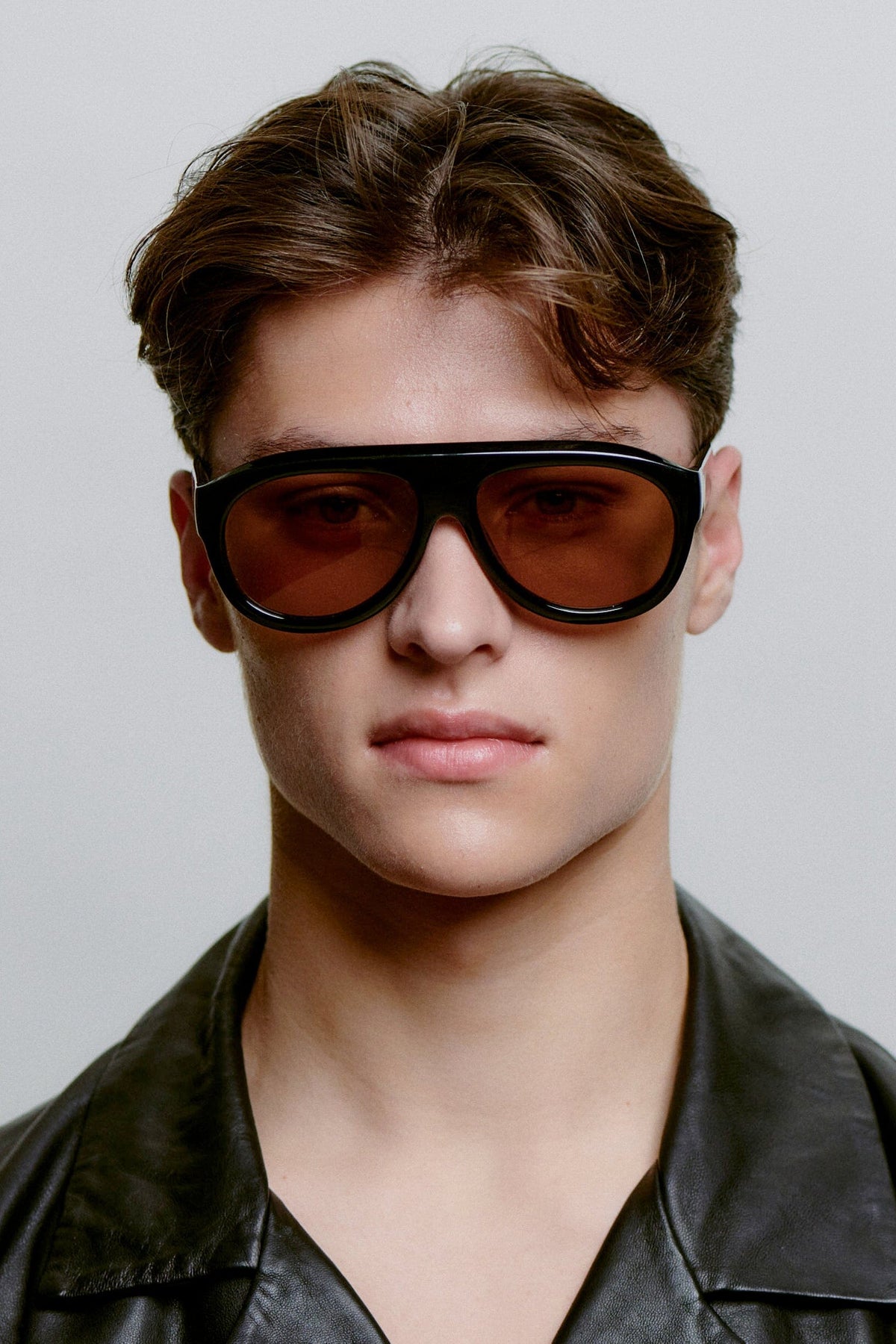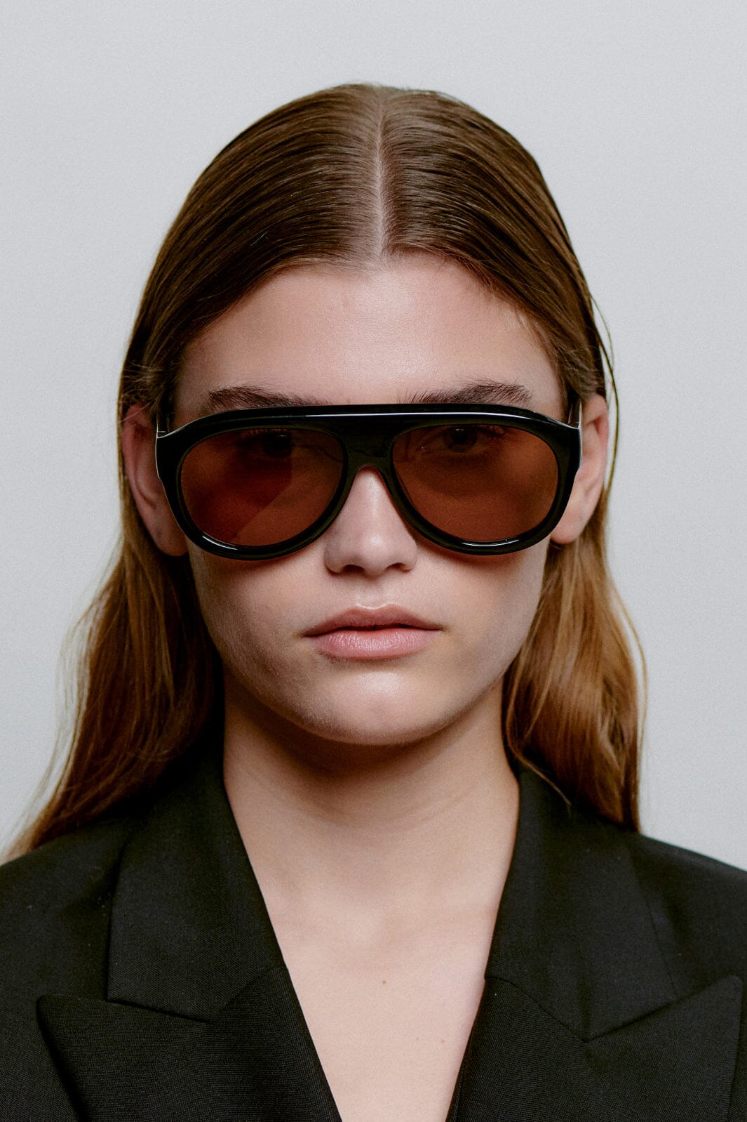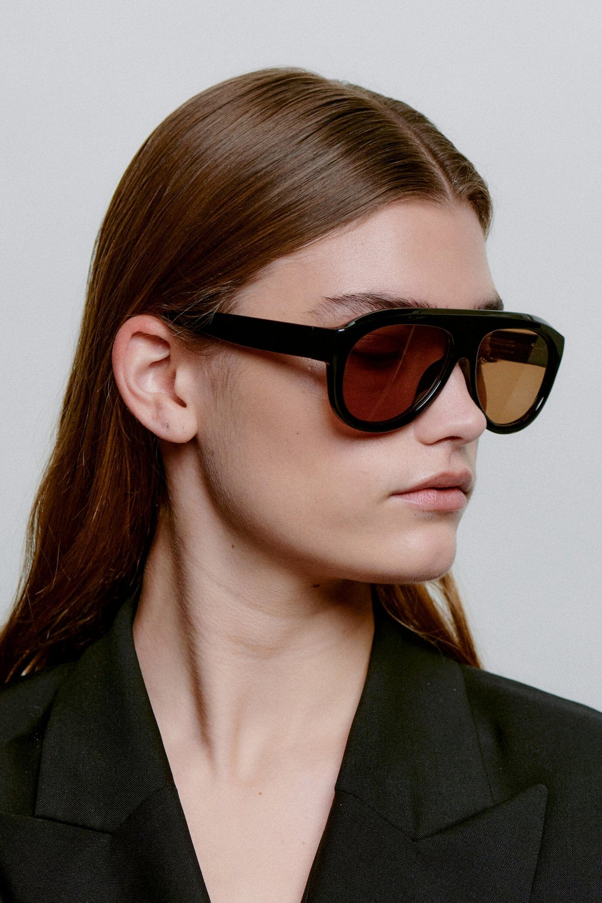 Svarte solbriller fra A. Kjærbede med aviator-inspirert innfatning. Brillene har en bred, skulpturert form med brune linser og en markant bro på 16 mm.