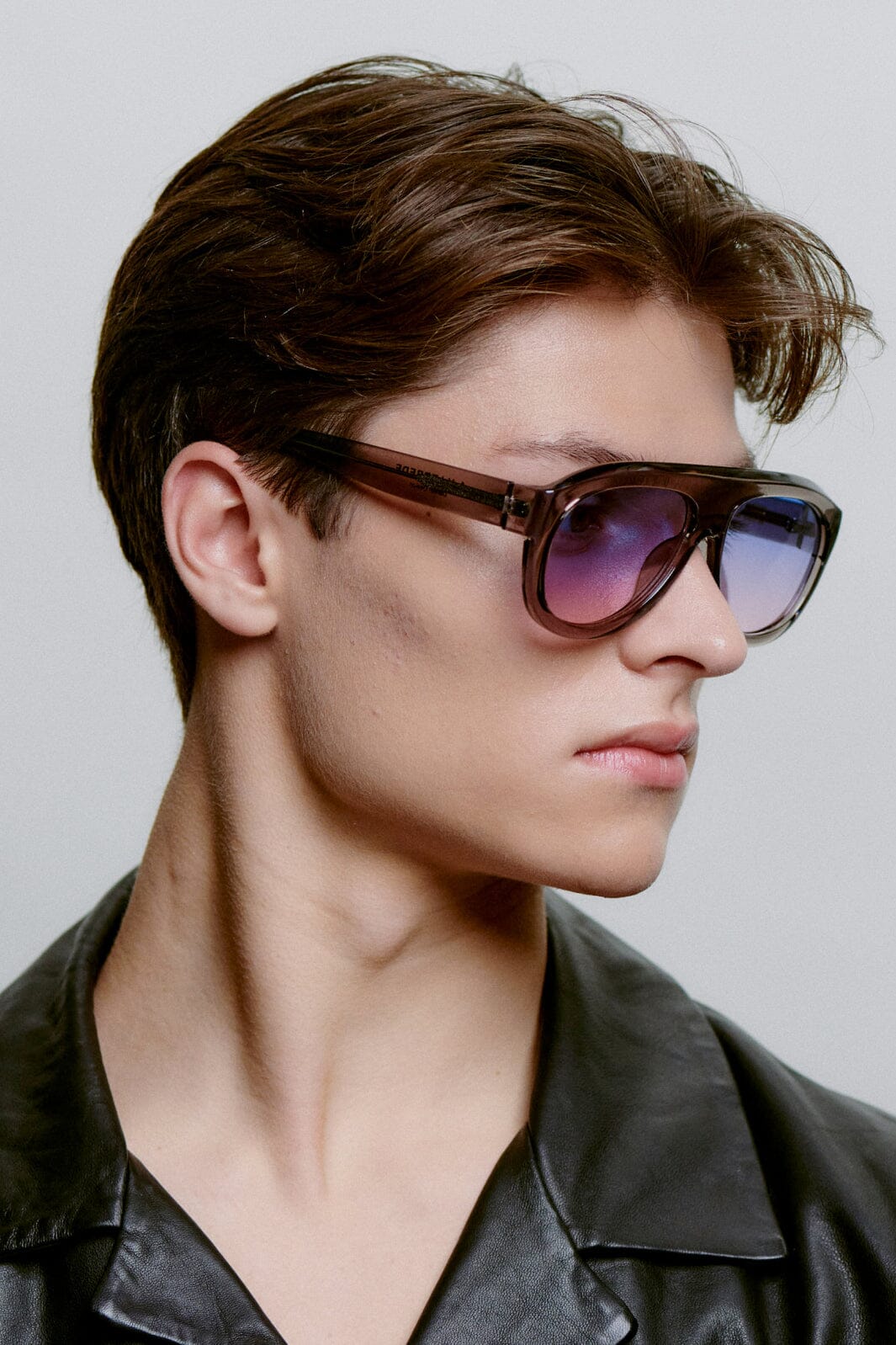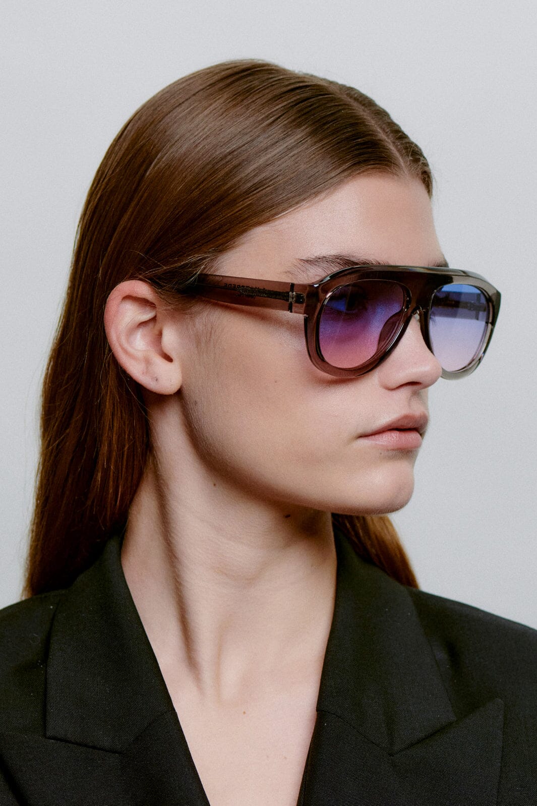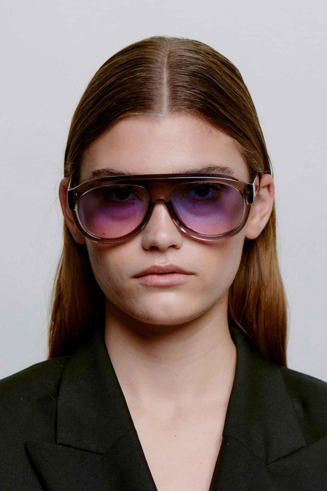 Solbriller fra A. Kjærbede med grå, transparent innfatning og gradientfargede linser fra blå til lyse nyanser. En oversized aviator-modell med bred bro på 16 mm.