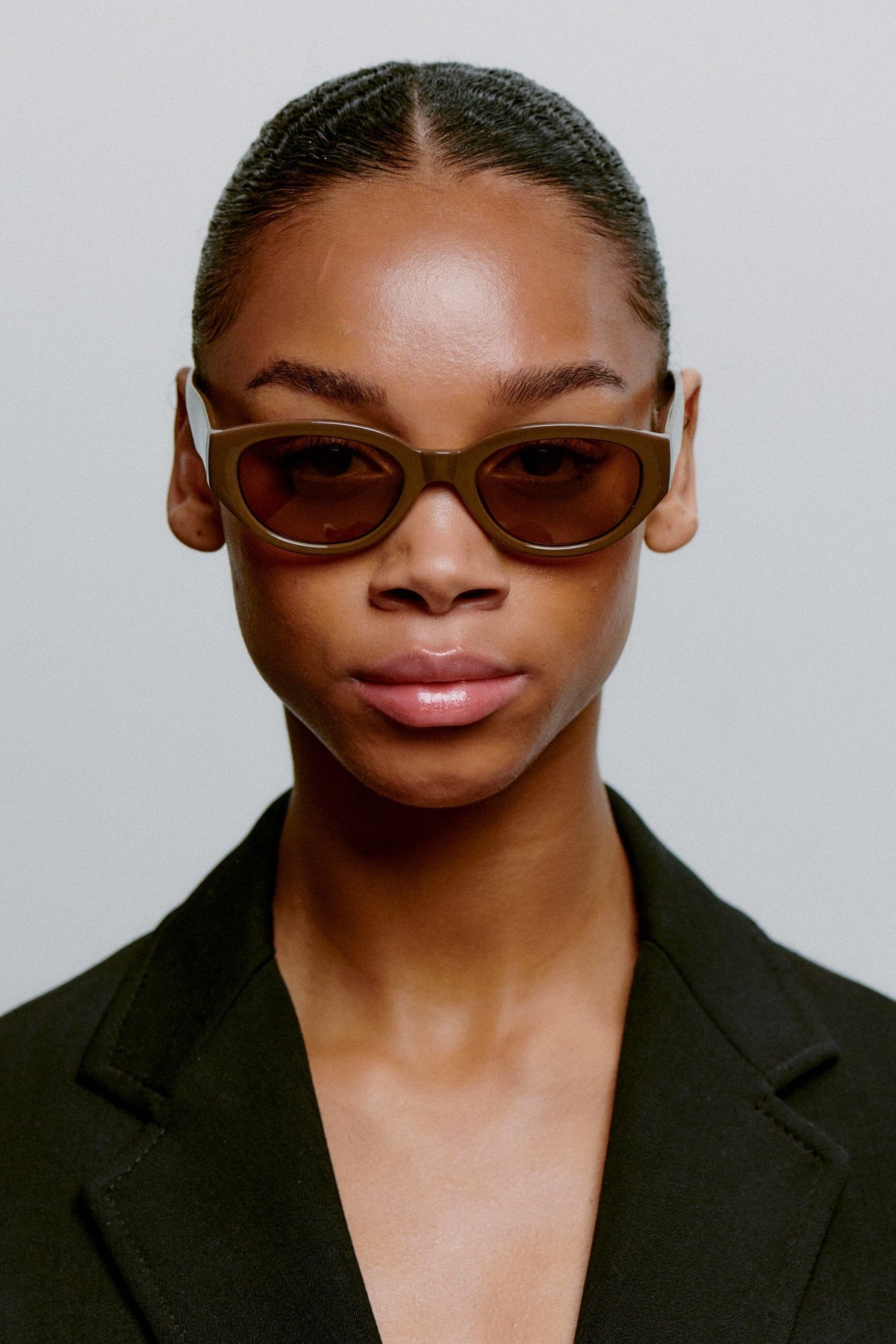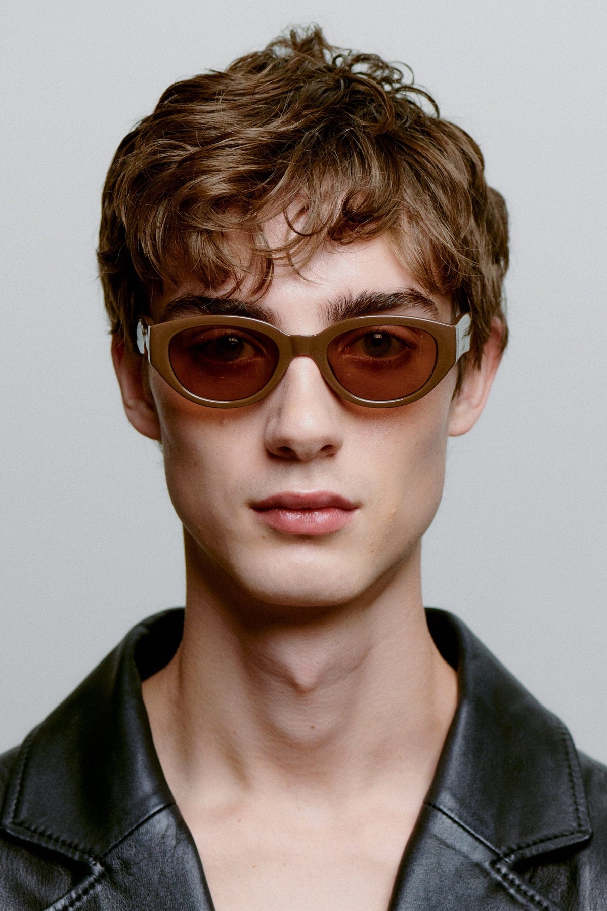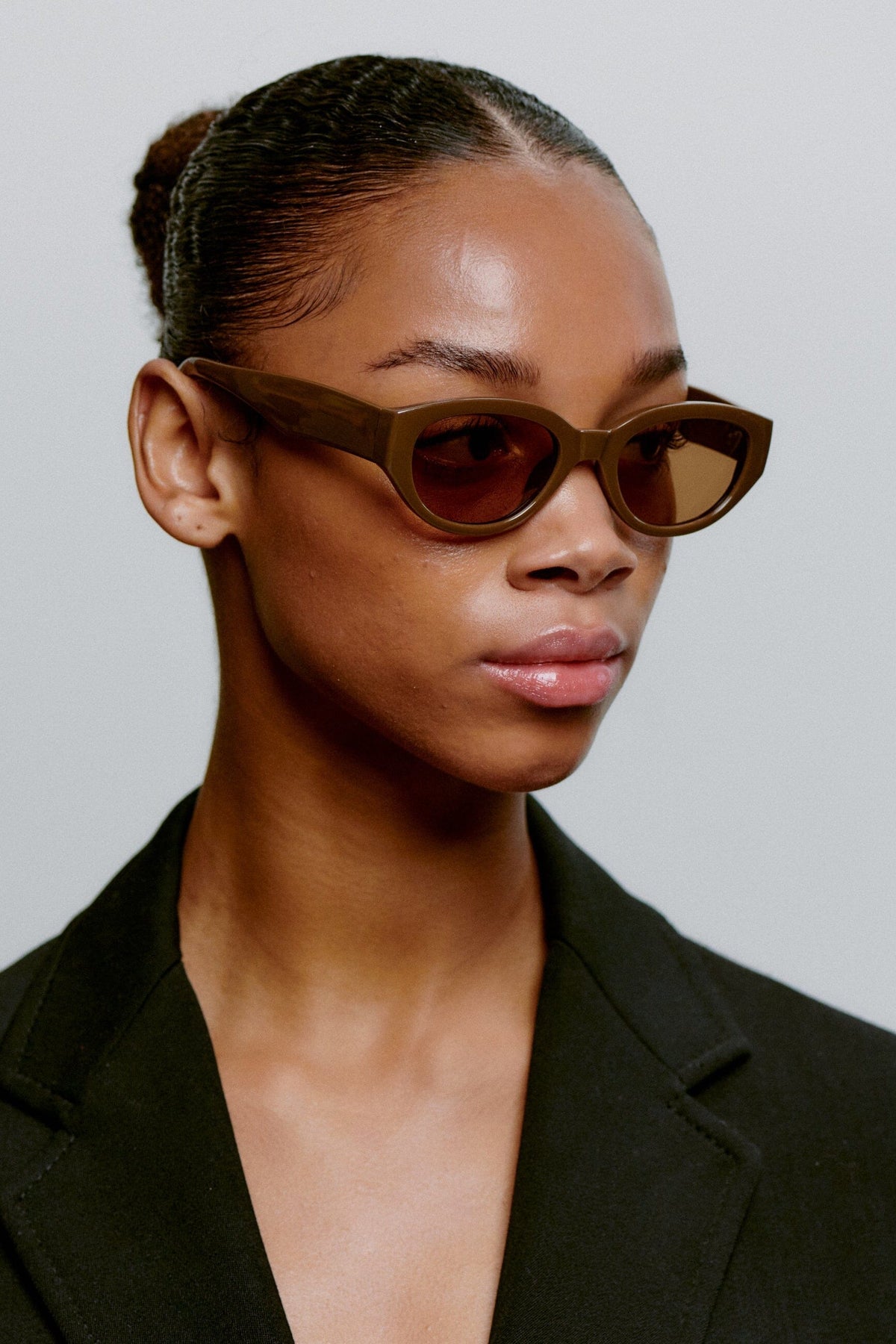 Brune solbriller fra A. Kjærbede med cat-eye form. Innfatningen har et tykt design i mørkebrunt Tritan Renew-materiale med formbare stenger og optiske hengsler av høy kvalitet.