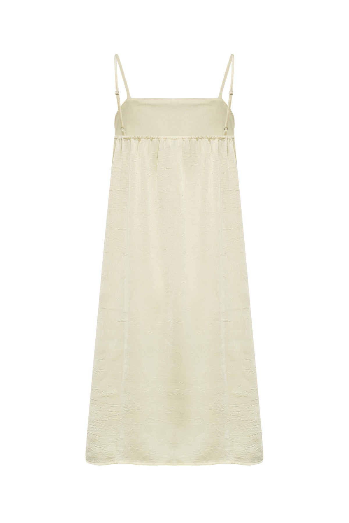 Kjole fra A-View i lysegul. Kjolen har spagettistropper og en firkantet utringning. Stoffet har en lett skinnende overflate.