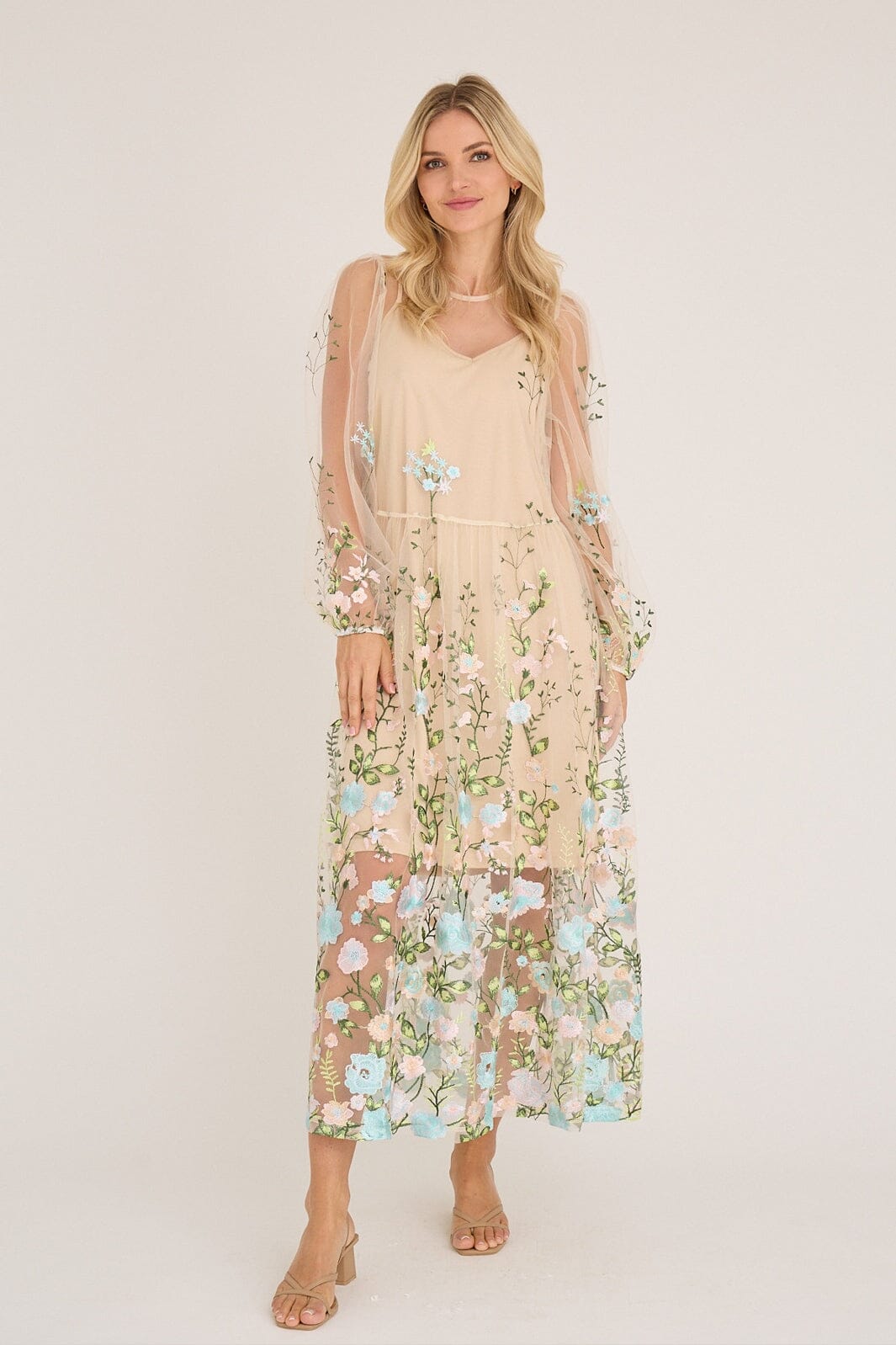 Kjole fra A-View i transparent mesh med broderte blomster i rosa og blå nyanser. Kjolen har en løs passform og er ankellang.