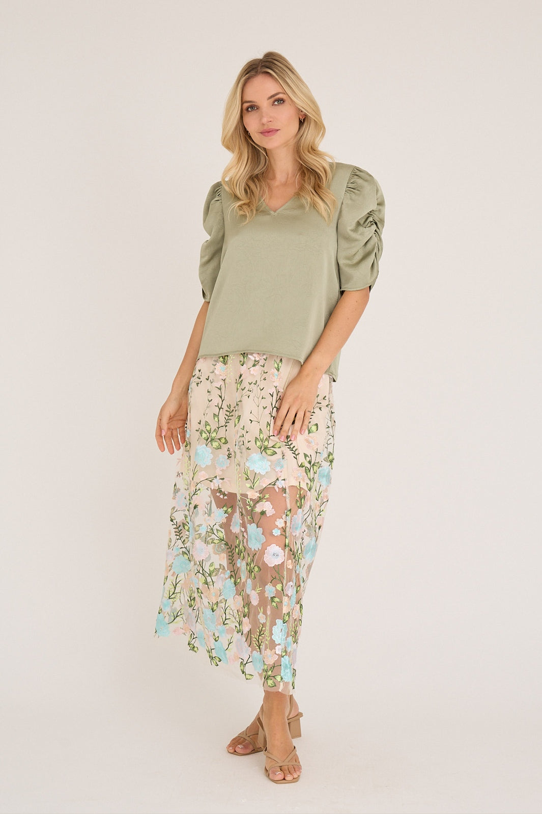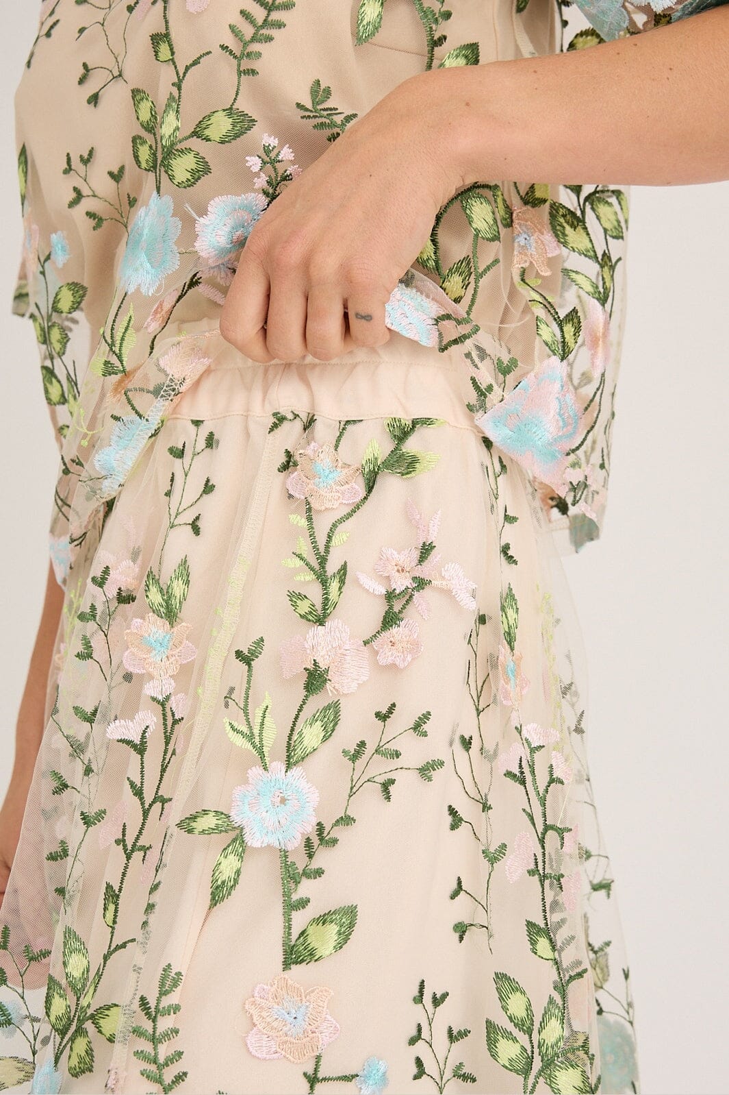 Langt skjørt fra A-View, laget av gjennomsiktig mesh med blomsterbroderi i rosa, lyseblå, beige og grønne nyanser.