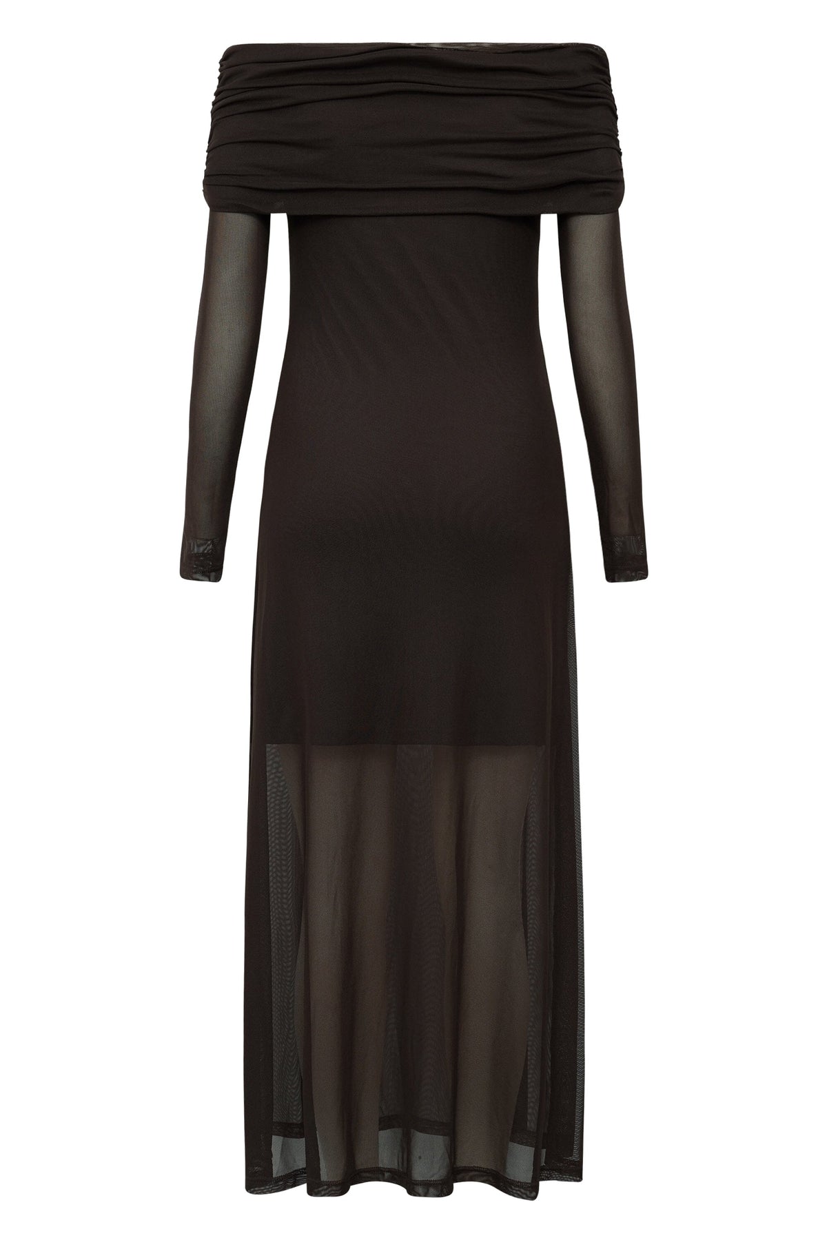 Svart ankellang kjole fra A-View med gjennomsiktige ermer og off-shoulder design. Den gjennomsiktige bunnen skaper et lag-på-lag-utseende med flotte detaljer.