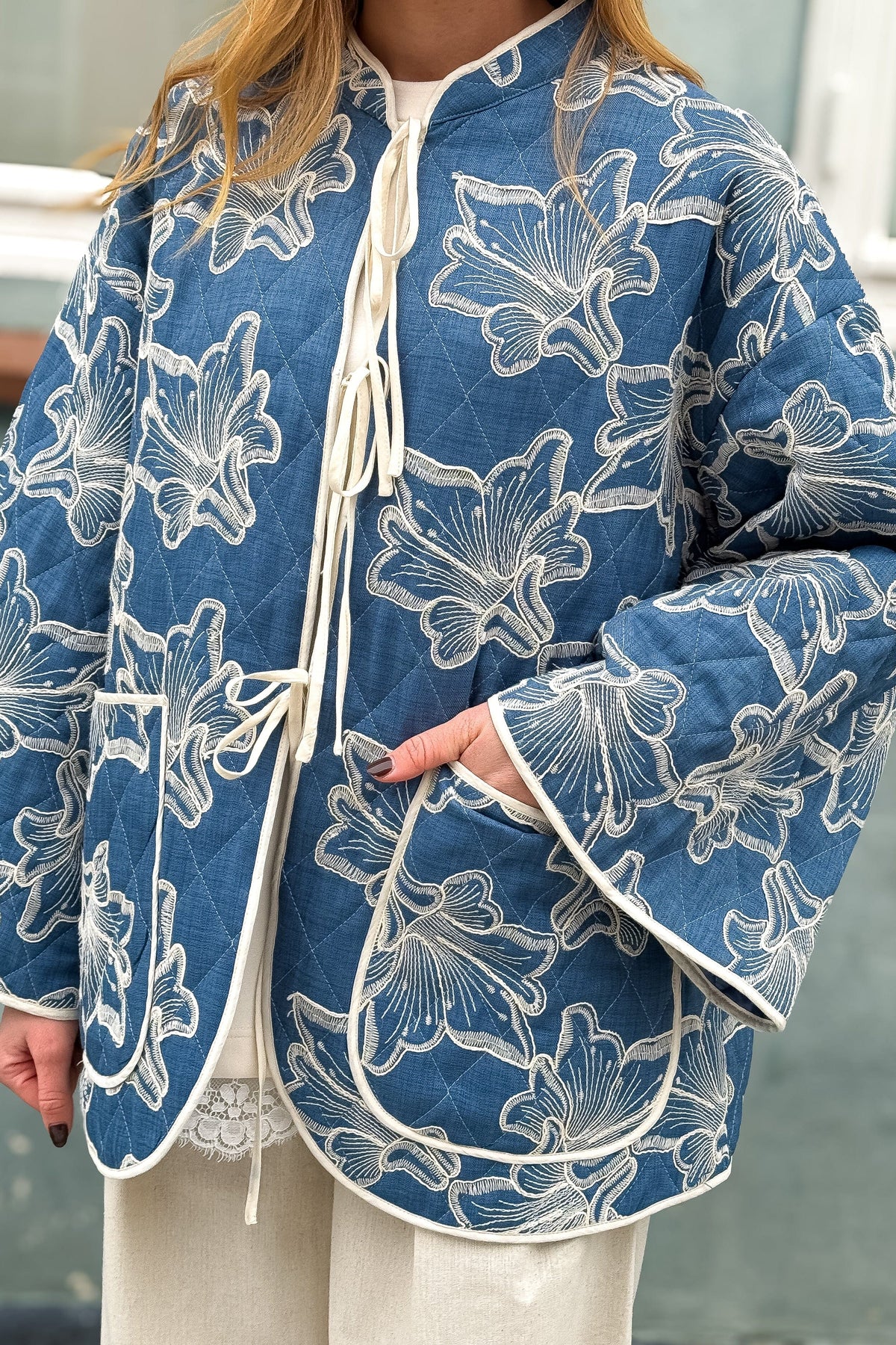 Blå jakke fra A-View med offwhite blomsterbroderi. Jakken har dekorative sømmer og knytedetaljer som gir den et håndlaget uttrykk.