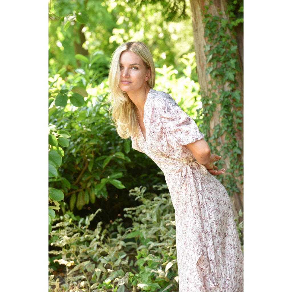 Kjole fra A-View med blomsterprint i rosa nyanser. Kjolen har puffede, korte ermer og en V-utringning med omslagsdesign.
