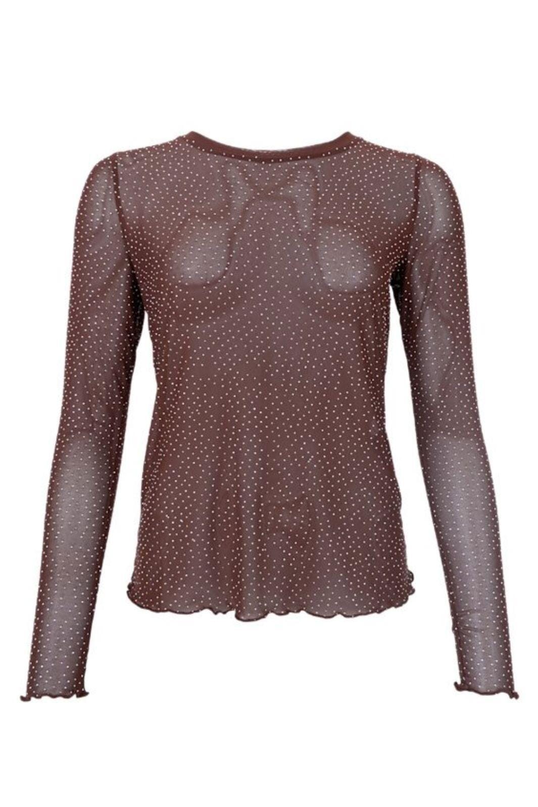 Langermet t-skjorte fra Black Colour i en varm kaffebrun nyanse. T-skjorten har et prikkete mønster og er pyntet med fine paljetter og dekorative sømmer.
