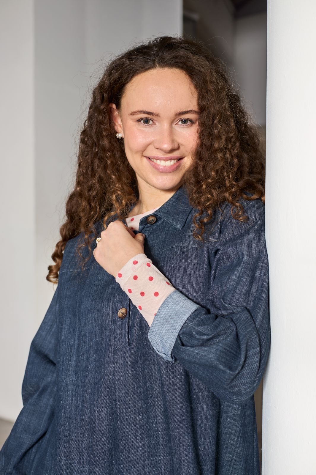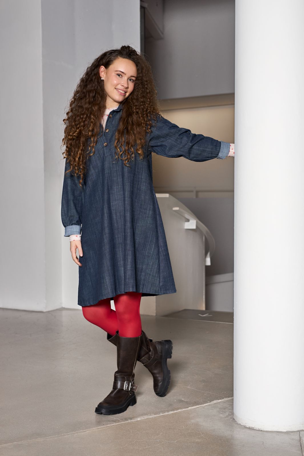En mørkeblå denimkjole fra Black Colour med A-formet silhuett. Kjolen har skjortekrage, lange ermer og knappelukking foran med dekorative sømmer.