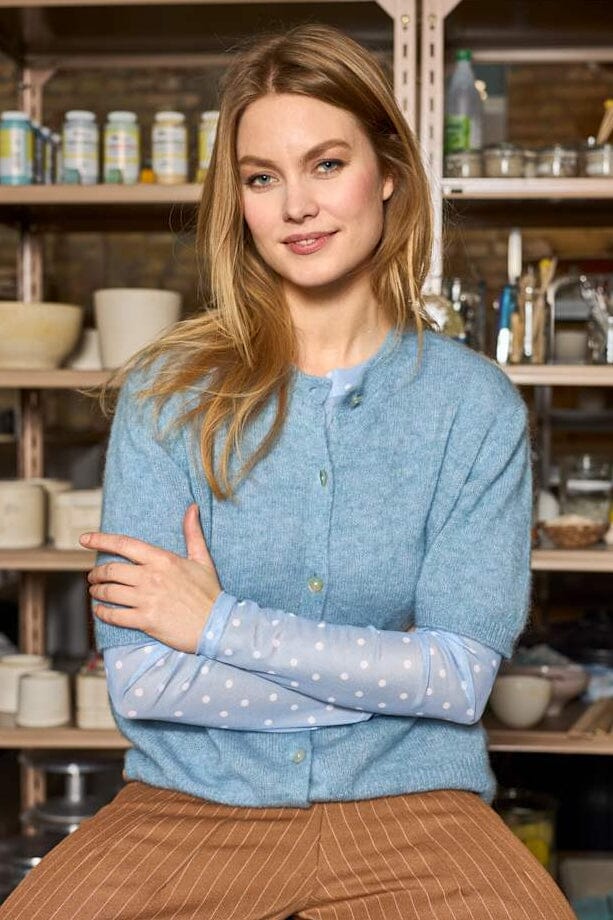 Lyseblå cardigan fra Black Colour med korte ermer og rund halsutringning. Cardiganen har en regular fit og er utsmykket med perledetaljer.