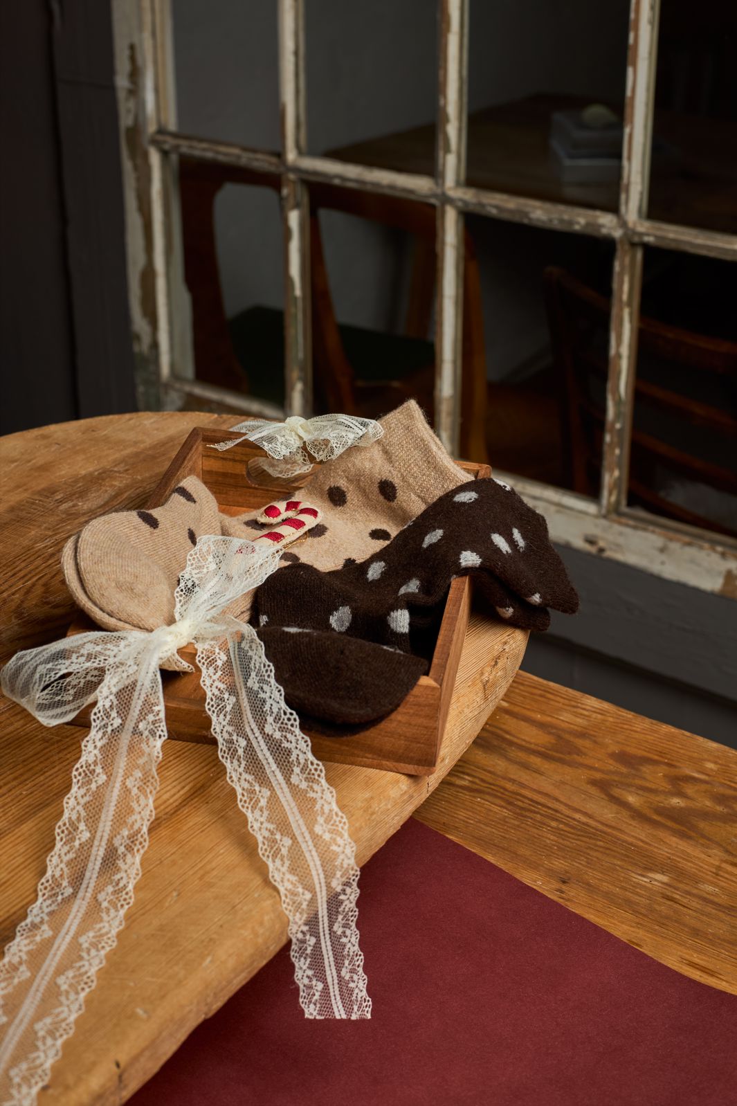 Sokker fra Black Colour i mørkebrun med hvite polkadotter. Sokkerne har middels høy skaftlengde og er laget av en myk materialblanding med ull.